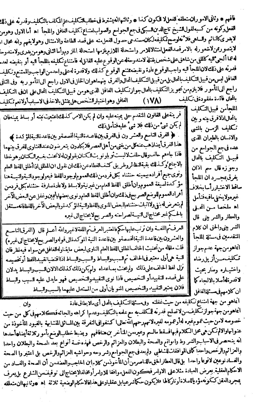 ـــــــــــــــــــــــــــــQفَافْهَمْ وَثَانِي الْأُمُورِ أَنَّ مُتَعَلِّقَهُ الْفِعْلُ لَا الْكَوْنُ كَذَا وَثَالِثُهَا أَنَّهُ يُشْتَرَطُ فِي خِطَابِ التَّكْلِيفِ عِلْمُ الْمُكَلَّفِ بِالتَّكْلِيفِ وَقُدْرَتُهُ عَلَى ذَلِكَ الْفِعْلِ وَكَوْنُهُ مِنْ كَسْبِهِ لِقَوْلِ الشَّيْخِ تَاجِ الدِّينِ السُّبْكِيّ فِي جَمْعِ الْجَوَامِعِ وَالصَّوَابُ امْتِنَاعُ تَكْلِيفِ الْغَافِلِ وَالْمُلْجَأِ اهـ.