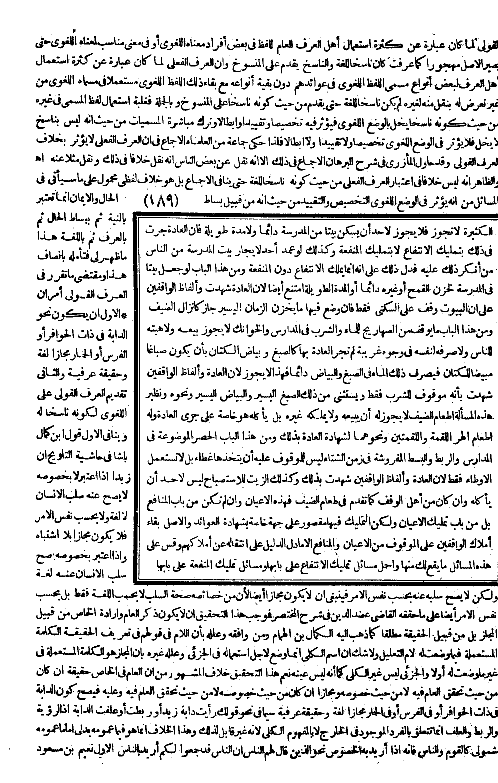 ـــــــــــــــــــــــــــــQالْقَوْلِيَّ لَمَّا كَانَ عِبَارَةً عَنْ كَثْرَةِ اسْتِعْمَالِ أَهْلِ الْعُرْفِ الْعَامِّ لِلَّفْظِ فِي بَعْضِ أَفْرَادِ مَعْنَاهُ اللُّغَوِيِّ أَوْ فِي مَعْنًى مُنَاسِبٍ لِمَعْنَاهُ اللُّغَوِيِّ حَتَّى يَصِيرَ الْأَصْلُ مَهْجُورًا كَمَا عَرَفْت كَانَ نَاسِخًا لِلُّغَةِ وَالنَّاسِخُ يُقَدَّمُ عَلَى الْمَنْسُوخِ وَأَنَّ الْعُرْفَ الْفِعْلِيَّ لَمَّا كَانَ عِبَارَةً عَنْ كَثْرَةِ اسْتِعْمَالِ أَهْلِ الْعُرْفِ لِبَعْضِ أَنْوَاعِ مُسَمَّى اللَّفْظِ اللُّغَوِيِّ فِي عَوَائِدِهِمْ دُونَ بَقِيَّةِ أَنْوَاعِهِ مَعَ بَقَاءِ ذَلِكَ اللَّفْظِ اللُّغَوِيِّ مُسْتَعْمَلًا فِي مُسَمَّاهُ اللُّغَوِيِّ مِنْ غَيْرِ تَعَرُّضٍ لَهُ بِنَقْلٍ مِنْهُ لِغَيْرِهِ لَمْ يَكُنْ نَاسِخًا لِلُّغَةِ حَتَّى يُقَدَّمَ مِنْ حَيْثُ كَوْنِهِ نَاسِخًا عَلَى الْمَنْسُوخِ وَبِالْجُمْلَةِ فَغَلَبَةُ اسْتِعْمَالِ لَفْظِ الْمُسَمَّى فِي غَيْرِهِ مِنْ حَيْثُ كَوْنِهِ نَاسِخًا يُخِلُّ بِالْوَضْعِ اللُّغَوِيِّ فَيُؤَثِّرُ فِيهِ تَخْصِيصًا وَتَقْيِيدًا وَإِبْطَالًا وَتَرْكُ مُبَاشَرَةِ الْمُسَمَّيَاتِ مِنْ حَيْثُ إنَّهُ لَيْسَ بِنَاسِخٍ لَا يُخِلُّ فَلَا يُؤَثِّرُ فِي الْوَضْعِ اللُّغَوِيِّ تَخْصِيصًا وَلَا تَقْيِيدًا وَلَا إبْطَالًا فَلِذَا حَكَى جَمَاعَةٌ مِنْ الْعُلَمَاءِ الْإِجْمَاعَ فِي أَنَّ الْعُرْفَ الْفِعْلِيَّ لَا يُؤَثِّرُ بِخِلَافِ الْعُرْفِ الْقَوْلِيِّ وَقَدْ حَاوَلَ الْمَازِرِيُّ فِي شَرْحِ الْبُرْهَانِ الْإِجْمَاعَ فِي ذَلِكَ إلَّا أَنَّهُ نُقِلَ عَنْ بَعْضِ النَّاسِ أَنَّهُ نَقَلَ خِلَافًا فِي ذَلِكَ وَنَقَلَ مَثَلًا عَنْهُ. اهـ.