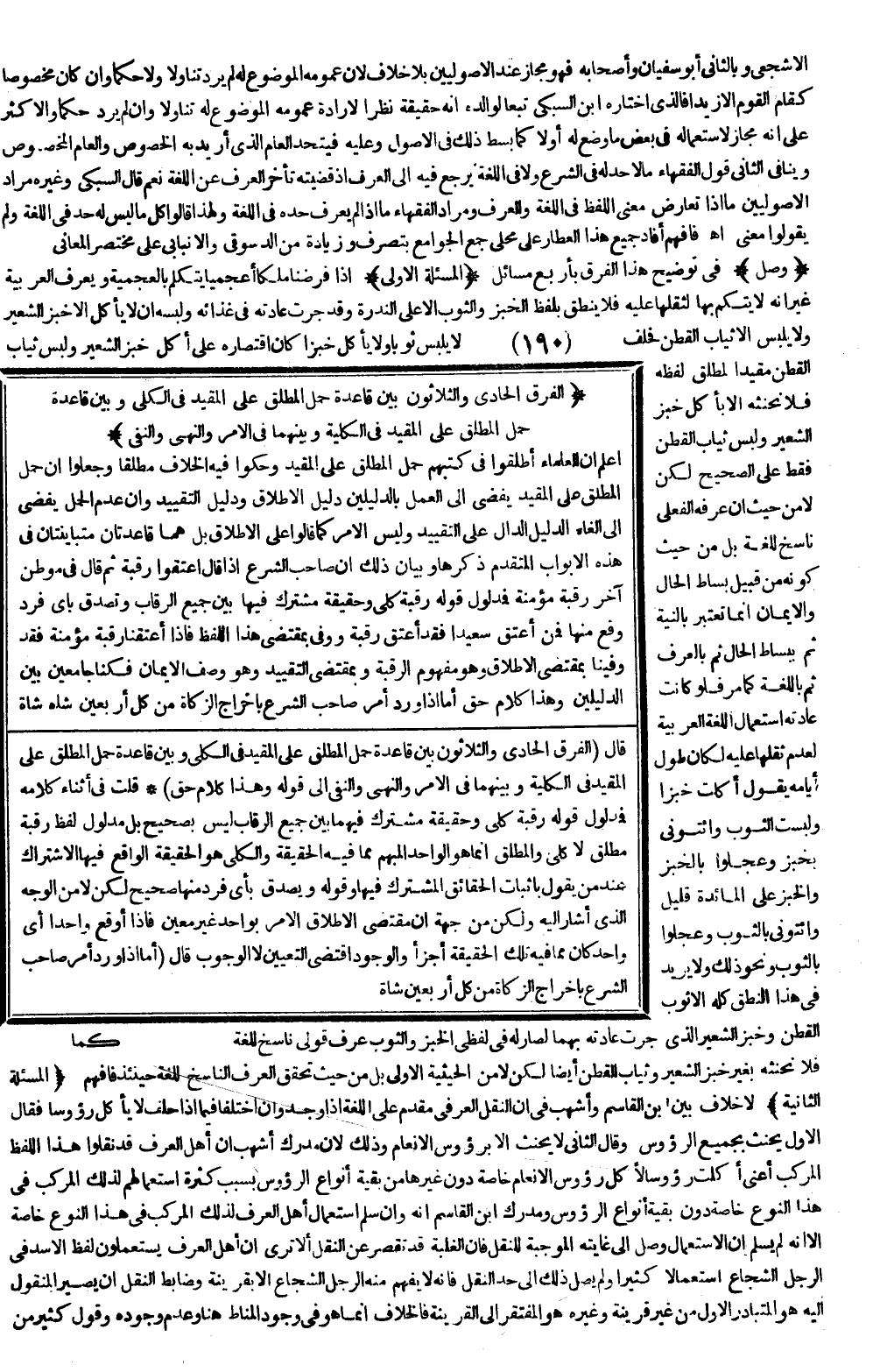 ثُمَّ بِاللُّغَةِ كَمَا مَرَّ فَلَوْ كَانَتْ عَادَتُهُ اسْتِعْمَالَ اللُّغَةِ الْعَرَبِيَّةِ لِعَدَمِ ثِقَلِهَا عَلَيْهِ لَكَانَ طُولَ أَيَّامِهِ يَقُولُ أَكَلْت خُبْزًا وَلَبِسْت الثَّوْبَ وَأْتُونِي بِخُبْزٍ وَعَجِّلُوا بِالْخُبْزِ وَالْخُبْزُ عَلَى الْمَائِدَةِ قَلِيلٌ وَأْتُونِي بِالثَّوْبِ وَعَجِّلُوا بِالثَّوْبِ وَنَحْوِ ذَلِكَ وَلَا يُرِيدُ فِي هَذَا النُّطْقِ كُلِّهِ إلَّا ثَوْبَ الْقُطْنِ وَخُبْزَ الشَّعِيرِ الَّذِي جَرَتْ عَادَتُهُ بِهِمَا لَصَارَ لَهُ فِي لَفْظَيْ الْخُبْزِ وَالثَّوْبِ عُرْفٌ قَوْلِيٌّ نَاسِخٌ لِلُّغَةِ فَلَا نُحَنِّثُهُ بِغَيْرِ خُبْزِ الشَّعِيرِ وَثِيَابِ الْقُطْنِ أَيْضًا لَكِنْ لَا مِنْ الْحَيْثِيَّةِ الْأُولَى بَلْ مِنْ حَيْثُ تَحَقُّقِ الْعُرْفِ النَّاسِخِ لِلُّغَةِ حِينَئِذٍ فَافْهَمْ (الْمَسْأَلَةُ الثَّانِيَةُ) لَا خِلَافَ بَيْنَ ابْنِ الْقَاسِمِ وَأَشْهَبَ فِي أَنَّ النَّقْلَ الْعُرْفِيَّ مُقَدَّمٌ عَلَى اللُّغَةِ إذَا وُجِدَ وَإِنْ اخْتَلَفَا فِيمَا إذَا حَلَفَ لَا يَأْكُلُ رُءُوسًا فَقَالَ الْأَوَّلُ يَحْنَثُ بِجَمِيعِ الرُّءُوسِ وَقَالَ الثَّانِي لَا يَحْنَثُ إلَّا بِرُءُوسِ الْأَنْعَامِ وَذَلِكَ لِأَنَّ مُدْرَكَ أَشْهَبَ أَنَّ أَهْلَ الْعُرْفِ قَدْ نَقَلُوا هَذَا اللَّفْظَ الْمُرَكَّبَ أَعْنِي أَكَلْت رُءُوسًا لِأَكْلِ رُءُوسِ الْأَنْعَامِ خَاصَّةً دُونَ غَيْرِهَا مِنْ بَقِيَّةِ أَنْوَاعِ الرُّءُوسِ بِسَبَبِ كَثْرَةِ اسْتِعْمَالِهِمْ لِذَلِكَ الْمُرَكَّبِ فِي هَذَا النَّوْعِ خَاصَّةً دُونَ بَقِيَّةِ أَنْوَاعِ الرُّءُوسِ وَمُدْرَكَ ابْنِ الْقَاسِمِ أَنَّهُ وَإِنْ سَلِمَ اسْتِعْمَالُ أَهْلِ الْعُرْفِ لِذَلِكَ الْمُرَكَّبِ فِي هَذَا النَّوْعِ خَاصَّةً إلَّا أَنَّهُ لَمْ يَسْلَمْ أَنَّ الِاسْتِعْمَالَ وَصَلَ إلَى غَايَتِهِ الْمُوجِبَةِ لِلنَّقْلِ فَإِنَّ الْغَلَبَةَ قَدْ تَقْصُرُ عَنْ النَّقْلِ أَلَا تَرَى أَنَّ أَهْلَ الْعُرْفِ يَسْتَعْمِلُونَ لَفْظَ الْأَسَدِ فِي الرَّجُلِ الشُّجَاعِ اسْتِعْمَالًا مُثِيرًا وَلَمْ يَصِلْ ذَلِكَ إلَى حَدِّ النَّقْلِ فَإِنَّهُ لَا يُفْهَمُ مِنْهُ الرَّجُلُ الشُّجَاعُ إلَّا بِقَرِينَةٍ وَضَابِطُ النَّقْلِ أَنْ يَصِيرَ الْمَنْقُولُ إلَيْهِ هُوَ الْمُتَبَادَرُ الْأَوَّلُ مِنْ غَيْرِ قَرِينَةٍ وَغَيْرُهُ هُوَ الْمُفْتَقِرُ إلَى الْقَرِينَةِ فَالْخِلَافُ إنَّمَا هُوَ فِي وُجُودِ الْمَنَاطِ هُنَا وَعَدَمِ وُجُودِهِ.
