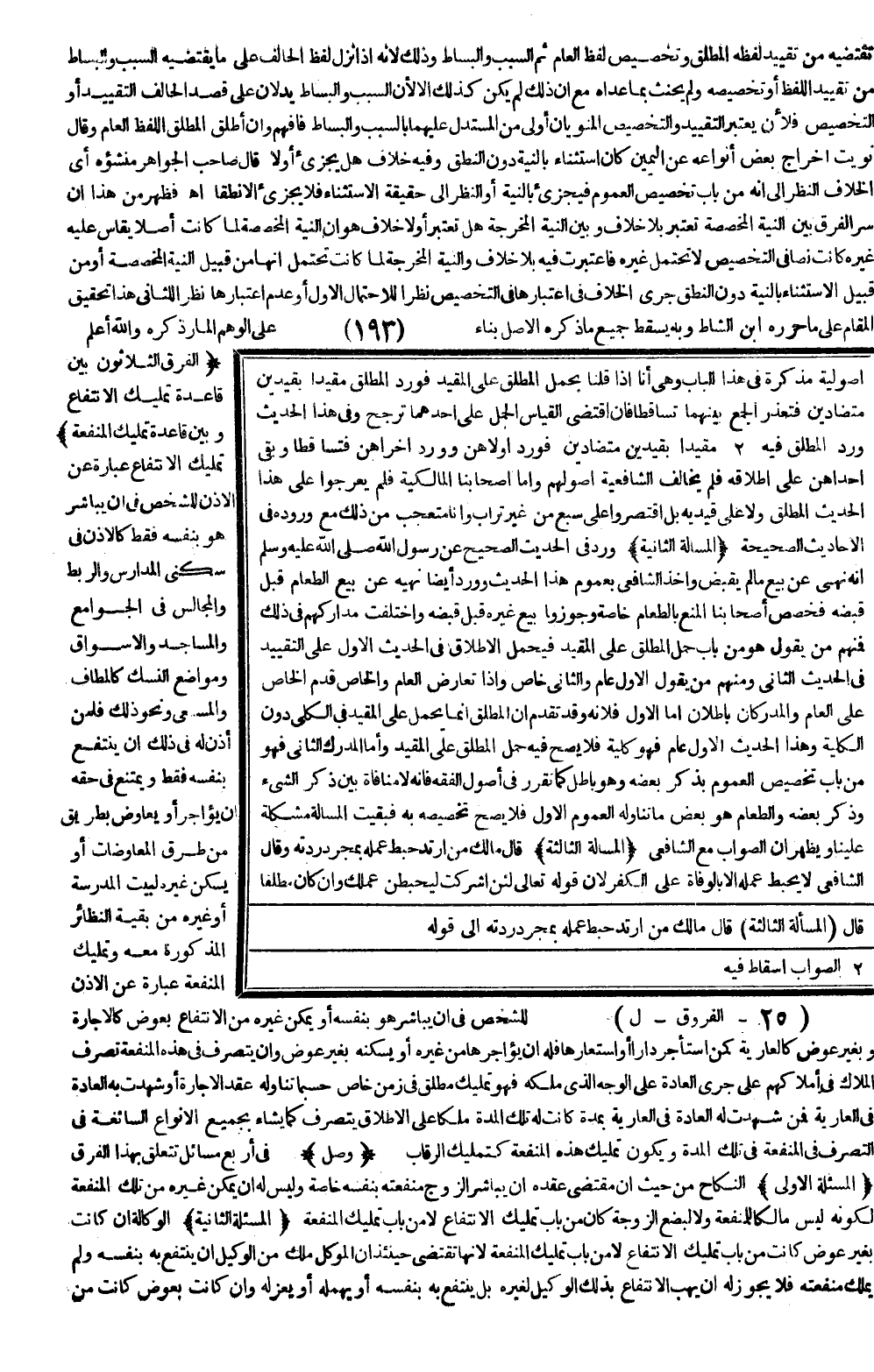(الْفَرْقُ الثَّلَاثُونَ بَيْنَ قَاعِدَةِ تَمْلِيكِ الِانْتِفَاعِ وَبَيْنَ قَاعِدَةِ تَمْلِيكِ الْمَنْفَعَةِ) تَمْلِيكُ الِانْتِفَاعِ عِبَارَةٌ عَنْ الْإِذْنِ لِلشَّخْصِ فِي أَنْ يُبَاشِرَ هُوَ بِنَفْسِهِ فَقَطْ كَالْإِذْنِ فِي سُكْنَى الْمَدَارِسِ وَالرَّبْطِ وَالْمَجَالِسِ فِي الْجَوَامِعِ وَالْمَسَاجِدِ وَالْأَسْوَاقِ وَمَوَاضِعِ النُّسُكِ كَالْمَطَافِ وَالْمَسْعَى وَنَحْوِ ذَلِكَ فَلِمَنْ أُذِنَ لَهُ فِي ذَلِكَ أَنْ يَنْتَفِعَ بِنَفْسِهِ فَقَطْ وَيَمْتَنِعَ فِي حَقِّهِ أَنْ يُؤَاجِرَ أَوْ يُعَاوِضَ بِطَرِيقٍ مِنْ طُرُقِ الْمُعَاوَضَاتِ أَوْ يُسَكِّنَ غَيْرَهُ لِبَيْتِ الْمَدْرَسَةِ أَوْ غَيْرُهُ مِنْ بَقِيَّةِ النَّظَائِرِ الْمَذْكُورَةِ مَعَهُ وَتَمْلِيكُ الْمَنْفَعَةِ عِبَارَةٌ عَنْ الْإِذْنِ لِلشَّخْصِ فِي أَنْ يُبَاشِرَ هُوَ بِنَفْسِهِ أَوْ يُمَكِّنَ غَيْرَهُ مِنْ الِانْتِفَاعِ بِعِوَضٍ كَالْإِجَارَةِ وَبِغَيْرِ عِوَضٍ كَالْعَارِيَّةِ كَمَنْ اسْتَأْجَرَ دَارًا أَوْ اسْتَعَارَهَا فَلَهُ أَنْ يُؤَاجِرَهَا مِنْ غَيْرِهِ أَوْ يُسَكِّنَهُ بِغَيْرِ عِوَضٍ وَأَنْ يَتَصَرَّفَ فِي هَذِهِ الْمَنْفَعَةِ تَصَرُّفَ الْمُلَّاكِ فِي أَمْلَاكِهِمْ عَلَى جَرْيِ الْعَادَةِ عَلَى الْوَجْهِ الَّذِي مَلَكَهُ فَهُوَ تَمْلِيكٌ مُطْلَقٌ فِي زَمَنٍ خَاصٍّ حَسْبَمَا تَنَاوَلَهُ عَقْدُ الْإِجَارَةِ أَوْ شَهِدَتْ بِهِ الْعَادَةُ فِي الْعَارِيَّةِ فَمَنْ شَهِدَتْ لَهُ الْعَادَةُ فِي الْعَارِيَّةِ بِمُدَّةٍ كَانَتْ لَهُ تِلْكَ الْمُدَّةُ مِلْكًا عَلَى الْإِطْلَاقِ يَتَصَرَّفُ كَمَا يَشَاءُ بِجَمِيعِ الْأَنْوَاعِ السَّائِغَةِ فِي التَّصَرُّفِ فِي الْمَنْفَعَةِ فِي تِلْكَ الْمُدَّةِ وَيَكُونُ تَمْلِيكُ هَذِهِ الْمَنْفَعَةِ كَتَمْلِيكِ الرِّقَابِ (وَصْلٌ) فِي أَرْبَعِ مَسَائِلَ تَتَعَلَّقُ بِهَذَا الْفَرْقِ.