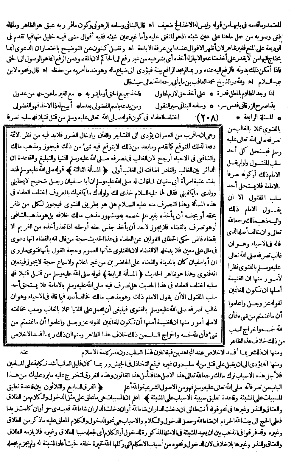 الْمَسْأَلَةُ الرَّابِعَةُ اخْتَلَفَ الْعُلَمَاءُ فِي كَوْنِ قَوْلِهِ - صَلَّى اللَّهُ تَعَالَى عَلَيْهِ وَسَلَّمَ - «مَنْ قَتَلَ قَتِيلًا فَلَهُ سَلَبُهُ» تَصَرُّفًا بِالْفَتْوَى عَمَلًا بِالْغَالِبِ مِنْ تَصَرُّفِهِ - صَلَّى اللَّهُ تَعَالَى عَلَيْهِ وَسَلَّمَ - فَيَسْتَحِلُّ كُلُّ أَحَدٍ سَلَبَ الْمَقْتُولِ وَلَوْ لَمْ يَقُلْ الْإِمَامُ ذَلِكَ أَوْ كَوْنِهِ تَصَرُّفًا بِالْإِمَامَةِ فَلَا يَسْتَحِلُّ أَحَدٌ سَلَبَ الْمَقْتُولِ إلَّا أَنْ يَقُولَ الْإِمَامُ ذَلِكَ وَإِلَيْهِ ذَهَبَ مَالِكٌ - رَحِمَهُ اللَّهُ تَعَالَى - وَإِنْ خَالَفَ أَصْلَهُ الَّذِي قَالَهُ فِي الْإِحْيَاءِ وَهُوَ أَنَّ غَالِبَ تَصَرُّفِهِ - صَلَّى اللَّهُ تَعَالَى عَلَيْهِ وَسَلَّمَ - بِالْفَتْوَى نَظَرًا لِأُمُورٍ مِنْهَا أَنَّ الْغَنِيمَةَ أَصْلُهَا أَنْ تَكُونَ لِلْغَانِمِينَ لِقَوْلِهِ عَزَّ وَجَلَّ {وَاعْلَمُوا أَنَّمَا غَنِمْتُمْ مِنْ شَيْءٍ فَأَنَّ لِلَّهِ خُمُسَهُ} [الأنفال: 41] وَإِخْرَاجُ السَّلَبِ مِنْ ذَلِكَ خِلَافُ هَذَا الظَّاهِرِ وَمِنْهَا أَنَّ ذَلِكَ رُبَّمَا أَفْسَدَ الْإِخْلَاصَ عِنْدَ الْمُجَاهِدِينَ فَيُقَاتِلُونَ لِهَذَا السَّلَبِ دُونَ نَصْرِ كَلِمَةِ الْإِسْلَامِ وَمِنْهَا أَنَّهُ يُؤَدِّي إلَى أَنْ يُقْبِلَ عَلَى قَتْلِ مَنْ لَهُ سَلَبٌ دُونَ غَيْرِهِ فَيَقَعَ التَّخَاذُلُ فِي الْجَيْشِ وَرُبَّمَا كَانَ قَلِيلُ السَّلَبِ أَشَدَّ نِكَايَةً عَلَى الْمُسْلِمِينَ فَلِأَجْلِ هَذِهِ الْأَسْبَابِ تَرَكَ مَالِكٌ - رَحِمَهُ اللَّهُ تَعَالَى - هَذَا الْأَصْلَ هُنَا، فَتَأَمَّلْ هَذَا الْقَانُونَ وَهَذِهِ الْفُرُوقَ لِتُخْرِجَ عَلَيْهِ مَا يَرِدُ عَلَيْك مِنْ هَذَا الْبَابِ مِنْ تَصَرُّفَاتِهِ - صَلَّى اللَّهُ تَعَالَى عَلَيْهِ وَسَلَّمَ - فَهُوَ مِنْ الْأُصُولِ الشَّرْعِيَّةِ وَاَللَّهُ أَعْلَمُ.