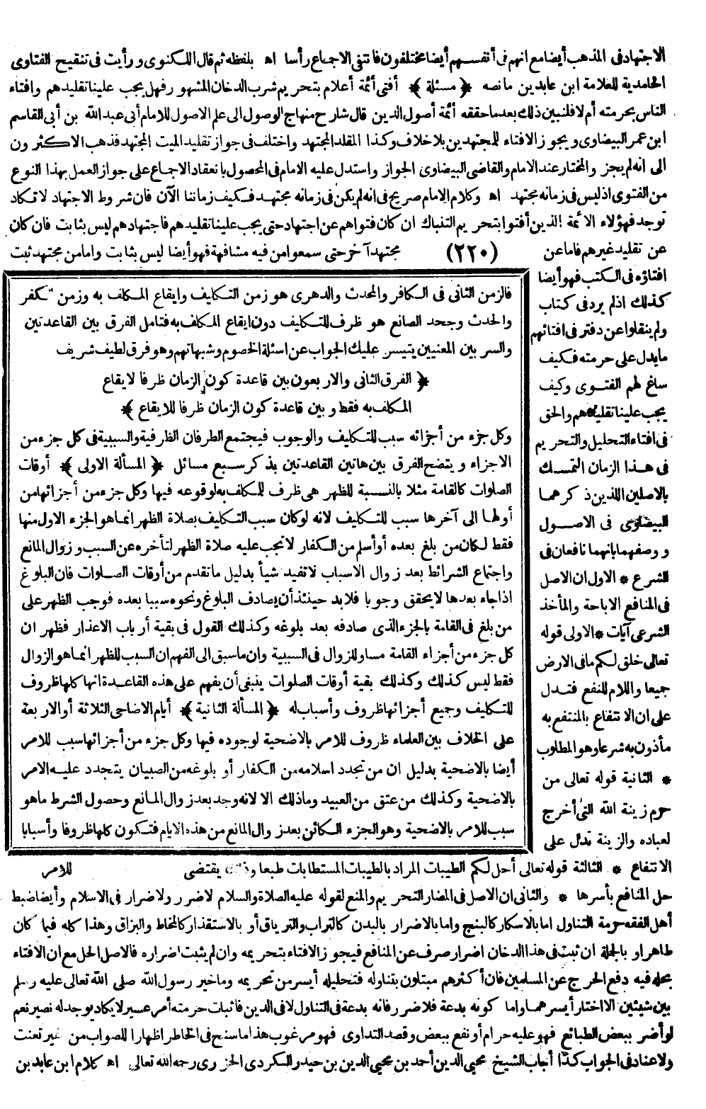 ثُمَّ قَالَ اللَّكْنَوِيُّ وَرَأَيْت فِي تَنْقِيحِ الْفَتَاوَى الْحَامِدِيَّةِ لِلْعَلَّامَةِ ابْنِ عَابْدِينَ مَا نَصُّهُ (مَسْأَلَةٌ) أَفْتَى أَئِمَّةٌ أَعْلَامٌ بِتَحْرِيمِ شُرْبِ الدُّخَانِ الْمَشْهُورِ فَهَلْ يَجِبُ عَلَيْنَا تَقْلِيدُهُمْ وَإِفْتَاءُ النَّاسِ بِحُرْمَتِهِ أَمْ لَا فَلْنُبَيِّنْ ذَلِكَ بَعْدَمَا حَقَّقَهُ أَئِمَّةُ أُصُولِ الدِّينِ قَالَ شَارِحُ مِنْهَاجِ الْوُصُولِ إلَى عِلْمِ الْأُصُولِ لِلْإِمَامِ أَبِي عَبْدِ اللَّهِ بْنِ أَبِي الْقَاسِمِ بْنِ عُمَر الْبَيْضَاوِيِّ وَيَجُوزُ الْإِفْتَاءُ لِلْمُجْتَهِدِينَ بِلَا خِلَافٍ وَكَذَا الْمُقَلِّدُ الْمُجْتَهِدُ وَاخْتُلِفَ فِي جَوَازِ تَقْلِيدِ الْمَيِّتِ الْمُجْتَهِدِ فَذَهَبَ الْأَكْثَرُونَ إلَى أَنَّهُ لَمْ يَجُزْ وَالْمُخْتَارُ عِنْدَ الْإِمَامِ وَالْقَاضِي الْبَيْضَاوِيِّ الْجَوَازُ وَاسْتَدَلَّ عَلَيْهِ الْإِمَامُ فِي الْمَحْصُولِ بِانْعِقَادِ الْإِجْمَاعِ عَلَى جَوَازِ الْعَمَلِ بِهَذَا النَّوْعِ مِنْ الْفَتْوَى إذْ لَيْسَ فِي زَمَانِهِ مُجْتَهِدٌ اهـ وَكَلَامُ الْإِمَامِ صَرِيحٌ فِي أَنَّهُ لَمْ يَكُنْ فِي زَمَانِهِ مُجْتَهِدٌ فَكَيْفَ زَمَانُنَا الْآنَ فَإِنَّ شُرُوطَ الِاجْتِهَادِ لَا تَكَادُ تُوجَدُ فَهَؤُلَاءِ الْأَئِمَّةُ الَّذِينَ أَفْتَوْا بِتَحْرِيمِ التُّنْبَاكِ إنْ كَانَ فَتْوَاهُمْ عَنْ اجْتِهَادٍ حَتَّى يَجِبَ عَلَيْنَا تَقْلِيدُهُمْ فَاجْتِهَادُهُمْ لَيْسَ بِثَابِتٍ فَإِنْ كَانَ عَنْ تَقْلِيدِ غَيْرِهِمْ فَإِمَّا عَنْ مُجْتَهِدٍ آخَرَ حَتَّى سَمِعُوا مَنْ فِيهِ مُشَافَهَةٌ فَهُوَ أَيْضًا لَيْسَ بِثَابِتٍ وَإِمَّا مِنْ مُجْتَهِدٍ ثَبَتَ إفْتَاؤُهُ فِي الْكُتُبِ فَهُوَ أَيْضًا كَذَلِكَ إذْ لَمْ يَرِدْ فِي كِتَابٍ وَلَمْ يَنْقُلُوا عَنْ دَفْتَرٍ فِي إفْتَائِهِمْ مَا يَدُلُّ عَلَى حُرْمَتِهِ فَكَيْفَ سَاغَ لَهُمْ الْفَتْوَى وَكَيْفَ يَجِبُ عَلَيْنَا تَقْلِيدُهُمْ وَالْحَقُّ فِي إفْتَاءِ التَّحْلِيلِ وَالتَّحْرِيمِ فِي هَذَا الزَّمَانِ التَّمَسُّكُ بِالْأَصْلَيْنِ اللَّذَيْنِ ذَكَرَهُمَا الْبَيْضَاوِيُّ فِي الْأُصُولِ وَوَصَفَهُمَا بِأَنَّهُمَا نَافِعَانِ فِي الشَّرْعِ