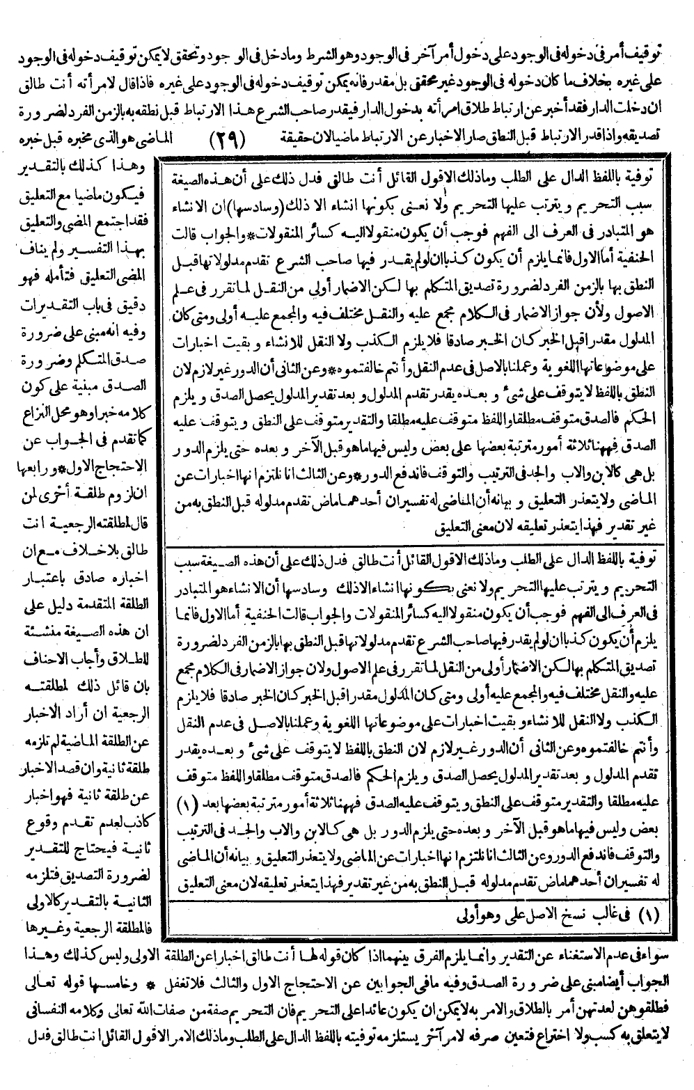 ـــــــــــــــــــــــــــــQتَوْقِيفُ أَمْرٍ فِي دُخُولِهِ فِي الْوُجُودِ عَلَى دُخُولِ أَمْرٍ آخَرَ فِي الْوُجُودِ وَهُوَ الشَّرْطُ، وَمَا دَخَلَ فِي الْوُجُودِ وَتَحَقَّقَ لَا يُمْكِنُ تَوْقِيفُ دُخُولِهِ فِي الْوُجُودِ عَلَى غَيْرِهِ بِخِلَافِ مَا كَانَ دُخُولُهُ فِي الْوُجُودِ غَيْرَ مُحَقَّقٍ بَلْ مُقَدَّرٌ فَإِنَّهُ يُمْكِنُ تَوْقِيفُ دُخُولِهِ فِي الْوُجُودِ عَلَى غَيْرِهِ فَإِذَا قَالَ لِامْرَأَتِهِ: أَنْتِ طَالِقٌ إنْ دَخَلْت الدَّارَ فَقَدْ أَخْبَرَ عَنْ ارْتِبَاطِ طَلَاقِ امْرَأَتِهِ بِدُخُولِ الدَّارِ فَيُقَدِّرُ صَاحِبُ الشَّرْعِ هَذَا الِارْتِبَاطَ قَبْلَ نُطْقِهِ بِهِ بِالزَّمَنِ الْفَرْدِ لِضَرُورَةِ تَصْدِيقِهِ، وَإِذَا قُدِّرَ الِارْتِبَاطُ قَبْلَ النُّطْقِ صَارَ الْإِخْبَارُ عَنْ الِارْتِبَاطِ مَاضِيًا؛ لِأَنَّ حَقِيقَةَ الْمَاضِي هُوَ الَّذِي مُخْبَرُهُ قَبِلَ خَبَرَهُ، وَهَذَا كَذَلِكَ بِالتَّقْدِيرِ فَيَكُونُ مَاضِيًا مَعَ التَّعْلِيقِ فَقَدْ اجْتَمَعَ الْمُضِيُّ وَالتَّعْلِيقُ بِهَذَا التَّفْسِيرِ، وَلَمْ يُنَافِ الْمُضِيُّ التَّعْلِيقَ فَتَأَمَّلْهُ فَهُوَ دَقِيقٌ فِي بَابِ التَّقْدِيرَاتِ، وَفِيهِ أَنَّهُ مَبْنِيٌّ عَلَى ضَرُورَةِ صِدْقِ الْمُتَكَلِّمِ، وَضَرُورَةُ الصِّدْقِ مَبْنِيَّةٌ عَلَى كَوْنِ كَلَامِهِ خَبَرًا، وَهُوَ مَحَلُّ النِّزَاعِ كَمَا تَقَدَّمَ فِي الْجَوَابِ عَنْ الِاحْتِجَاجِ الْأَوَّلِ.