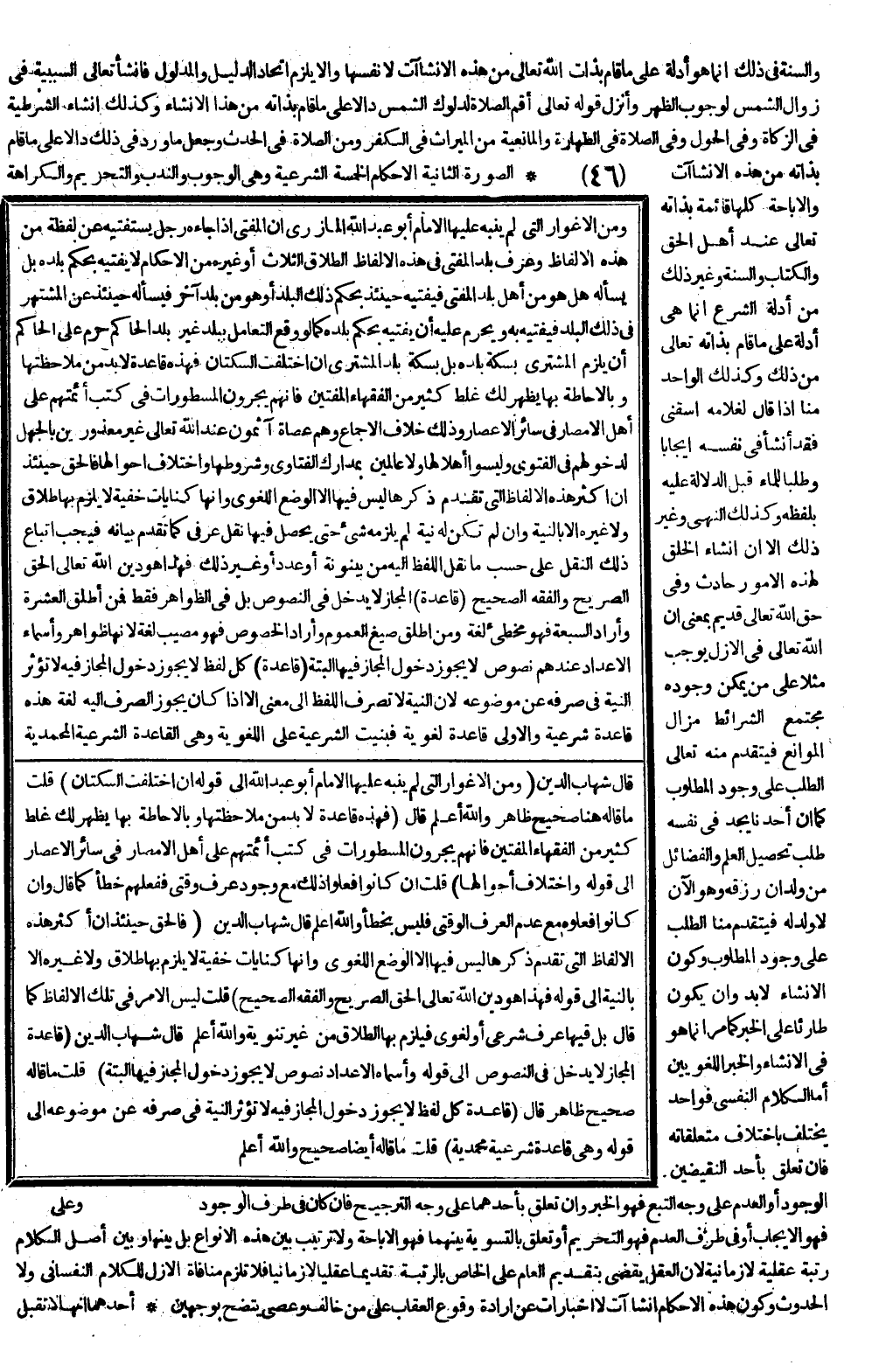 وَكَذَلِكَ النَّهْيُ وَغَيْرُ ذَلِكَ غَيْرَ أَنَّ إنْشَاءَ الْخَلْقِ لِهَذِهِ الْأُمُورِ حَادِثٌ وَفِي حَقِّ اللَّهِ تَعَالَى قَدِيمٌ بِمَعْنَى أَنَّ اللَّهَ تَعَالَى فِي الْأَزَلِ يُوجِبُ مَثَلًا عَلَى مَنْ يُمْكِنُ وُجُودُهُ مُجْتَمِعَ الشَّرَائِطِ مُزَالَ الْمَوَانِعِ فَيَتَقَدَّمُ مِنْهُ تَعَالَى الطَّلَبُ عَلَى وُجُودِ الْمَطْلُوبِ كَمَا أَنَّ أَحَدَنَا يَجِدُ فِي نَفْسِهِ طَلَبَ تَحْصِيلِ الْعِلْمِ وَالْفَضَائِلِ مِنْ وِلْدَانِ رِزْقِهِ وَهُوَ الْآنَ لَا وَلَدَ لَهُ، فَيَتَقَدَّمُ مِنَّا الطَّلَبُ عَلَى وُجُودِ الْمَطْلُوبِ وَكَوْنُ الْإِنْشَاءِ لَا بُدَّ وَأَنْ يَكُونَ طَارِئًا عَلَى الْخَبَرِ كَمَا مَرَّ إنَّمَا هُوَ فِي الْإِنْشَاءِ وَالْخَبَرِ اللُّغَوِيَّيْنِ أَمَّا الْكَلَامُ النَّفْسِيُّ فَوَاحِدٌ يَخْتَلِفُ بِاخْتِلَافِ مُتَعَلِّقَاتِهِ فَإِنْ تَعَلَّقَ بِأَحَدِ النَّقِيضَيْنِ الْوُجُودِ أَوْ الْعَدَمِ عَلَى وَجْهِ التَّبَعِ فَهُوَ الْخَبَرُ، وَإِنْ تَعَلَّقَ بِأَحَدِهِمَا عَلَى وَجْهِ التَّرْجِيحِ فَإِنْ كَانَ طَرَفُ الْوُجُودِ فَهُوَ الْإِيجَابُ أَوْ فِي طَرَفِ الْعَدَمِ فَهُوَ التَّحْرِيمُ أَوْ تَعَلَّقَ بِالتَّسْوِيَةِ بَيْنَهُمَا فَهُوَ الْإِبَاحَةُ وَلَا تَرْتِيبَ بَيْنَ هَذِهِ الْأَنْوَاعِ بَلْ بَيْنَهَا وَبَيْنَ أَصْلِ الْكَلَامِ رُتْبَةٌ عَقْلِيَّةٌ لَا زَمَانِيَّةٌ؛ لِأَنَّ الْعَقْلَ يَقْضِي بِتَقْدِيمِ الْعَامِّ عَلَى الْخَاصِّ بِالرُّتْبَةِ تَقْدِيمًا عَقْلِيًّا لَا زَمَانِيًّا فَلَا تَلْزَمُ مُنَافَاةُ الْأَزَلِ لِلْكَلَامِ النَّفْسَانِيِّ وَلَا الْحُدُوثِ، وَكَوْنُ هَذِهِ الْأَحْكَامِ إنْشَاءَاتٍ لَا إخْبَارَاتٍ عَنْ إرَادَةِ وُقُوعِ الْعِقَابِ عَلَى مَنْ خَالَفَ وَعَصَى يَتَّضِحُ بِوَجْهَيْنِ أَحَدُهُمَا أَنَّهَا لَا تَقْبَلُ