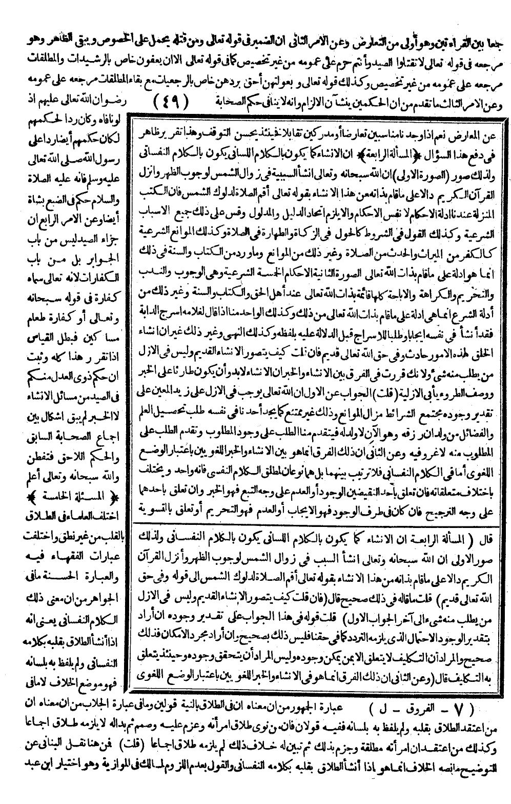 (الْمَسْأَلَةُ الرَّابِعَةُ) إنَّ الْإِنْشَاءَ كَمَا يَكُونُ بِالْكَلَامِ اللِّسَانِيِّ يَكُونُ بِالْكَلَامِ النَّفْسَانِيِّ وَلِذَلِكَ صُوَرٌ: (الصُّورَةُ الْأُولَى) أَنَّ اللَّهَ سُبْحَانَهُ وَتَعَالَى أَنْشَأَ السَّبَبِيَّةَ فِي زَوَالِ الشَّمْسِ لِوُجُوبِ الظُّهْرِ، وَأَنْزَلَ الْقُرْآنَ الْكَرِيمَ دَالًّا عَلَى مَا قَامَ بِذَاتِهِ مِنْ هَذَا الْإِنْشَاءِ بِقَوْلِهِ تَعَالَى {أَقِمِ الصَّلاةَ لِدُلُوكِ الشَّمْسِ} [الإسراء: 78] فَإِنَّ الْكُتُبَ الْمُنَزَّلَةَ عِنْدَنَا أَدِلَّةُ الْأَحْكَامِ لَا نَفْسُ الْأَحْكَامِ، وَإِلَّا يَلْزَمُ اتِّحَادُ الدَّلِيلِ وَالْمَدْلُولِ وَقِسْ عَلَى ذَلِكَ جَمِيعَ الْأَسْبَابِ الشَّرْعِيَّةِ، وَكَذَلِكَ الْقَوْلُ فِي الشُّرُوطِ كَالْحَوْلِ فِي الزَّكَاةِ وَالطَّهَارَةِ فِي الصَّلَاةِ، وَكَذَلِكَ الْمَوَانِعُ الشَّرْعِيَّةُ كَالْكُفْرِ مِنْ الْمِيرَاثِ وَالْحَدَثِ مِنْ الصَّلَاةِ وَغَيْرِ ذَلِكَ مِنْ الْمَوَانِعِ، وَمَا وَرَدَ مِنْ الْكِتَابِ وَالسُّنَّةِ فِي ذَلِكَ إنَّمَا هُوَ أَدِلَّةٌ عَلَى مَا قَامَ بِذَاتِ اللَّهِ تَعَالَى. الصُّورَةُ الثَّانِيَةُ الْأَحْكَامُ الْخَمْسَةُ الشَّرْعِيَّةُ وَهِيَ الْوُجُوب وَالنَّدْبُ وَالتَّحْرِيمُ وَالْكَرَاهَةُ وَالْإِبَاحَةُ كُلُّهَا قَائِمَةٌ بِذَاتِ اللَّهِ تَعَالَى عِنْدَ أَهْلِ الْحَقِّ، وَالْكِتَابُ وَالسُّنَّةُ وَغَيْرُ ذَلِكَ مِنْ أَدِلَّةِ الشَّرْعِ إنَّمَا هِيَ أَدِلَّةٌ عَلَى مَا قَامَ بِذَاتِ اللَّهِ تَعَالَى مِنْ ذَلِكَ، وَكَذَلِكَ الْوَاحِدُ مِنَّا إذَا قَالَ لِغُلَامِهِ اُسْرُجْ الدَّابَّةَ فَقَدْ أَنْشَأَ فِي نَفْسِهِ إيجَابًا وَطَلَبًا لِلْإِسْرَاجِ قَبْلَ الدَّلَالَةِ عَلَيْهِ بِلَفْظِهِ، وَكَذَلِكَ النَّهْيُ وَغَيْرُ ذَلِكَ غَيْرَ أَنَّ إنْشَاءَ الْخَلْقِ لِهَذِهِ الْأُمُورِ حَادِثٌ وَفِي حَقِّ اللَّهِ تَعَالَى قَدِيمٌ فَإِنْ قُلْتَ كَيْفَ يُتَصَوَّرُ الْإِنْشَاءُ الْقَدِيمُ وَلَيْسَ فِي الْأَزَلِ مَنْ يُطْلَبُ مِنْهُ شَيْءٌ، وَلِأَنَّك قَرَّرْتَ فِي الْفَرْقِ بَيْنَ الْإِنْشَاءِ وَالْخَبَرِ أَنَّ الْإِنْشَاءَ لَا بُدَّ وَأَنْ يَكُونَ طَارِئًا عَلَى الْخَبَرِ، وَوَصْفُ الطُّرُوءِ يَأْبَى الْأَزَلِيَّةَ.
