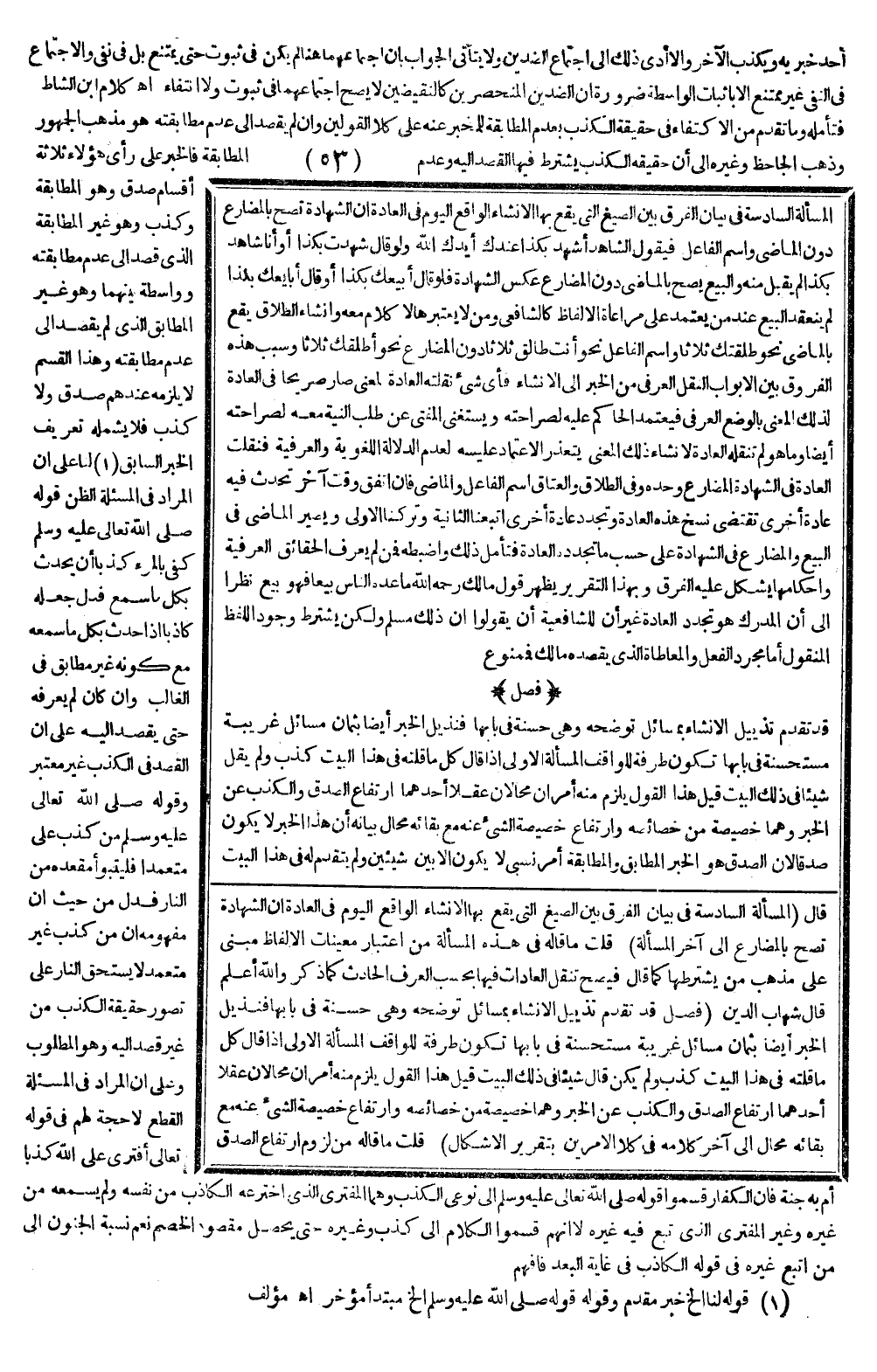 قَالَ شِهَابُ الدِّينِ (فَصْلٌ قَدْ تَقَدَّمَ تَذْيِيلُ الْإِنْشَاءِ بِمَسَائِلَ تُوَضِّحُهُ وَهِيَ حَسَنَةٌ فِي بَابِهَا فَنُذَيِّلُ الْخَبَرَ أَيْضًا بِثَمَانِ مَسَائِلَ غَرِيبَةٍ مُسْتَحْسَنَةٍ فِي بَابِهَا تَكُونُ طُرْفَةً لِلْوَاقِفِ. الْمَسْأَلَةُ الْأُولَى إذَا قَالَ كُلُّ مَا قُلْتُهُ فِي هَذَا الْبَيْتِ كَذِبٌ، وَلَمْ يَكُنْ قَالَ شَيْئًا فِي ذَلِكَ الْبَيْتِ قِيلَ هَذَا الْقَوْلُ يَلْزَمُ مِنْهُ أَمْرَانِ مُحَالَانِ عَقْلًا أَحَدُهُمَا ارْتِفَاعُ الصِّدْقِ وَالْكَذِبِ عَنْ الْخَبَرِ، وَهُمَا خَصِيصَةٌ مِنْ خَصَائِصِهِ، وَارْتِفَاعُ خَصِيصَةِ الشَّيْءِ عَنْهُ مَعَ بَقَائِهِ مُحَالٌ إلَى آخِرِ كَلَامِهِ فِي كِلَا الْأَمْرَيْنِ بِتَقْرِيرِ الْإِشْكَالِ) قُلْتُ مَا قَالَهُ مِنْ لُزُومِ ارْتِفَاعِ الصِّدْقِ
