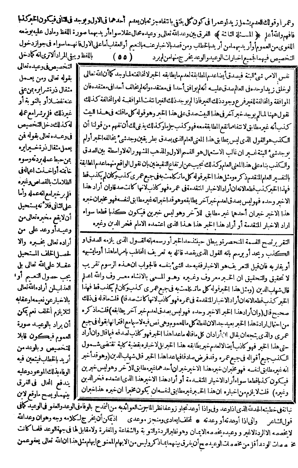 (الْمَسْأَلَةُ الثَّالِثَةُ) الْفَرْقُ بَيْنَ وَعْدِ اللَّهِ تَعَالَى وَوَعِيدِهِ مُحَالٌ عَقْلًا سَوَاءٌ أُرِيدَ بِهِمَا صُورَةُ اللَّفْظِ وَمَا دَلَّ عَلَيْهِ بِوَضْعِهِ اللُّغَوِيِّ مِنْ الْعُمُومِ، أَوْ أُرِيدَ بِهِمَا مَنْ أُرِيدَ بِالْخِطَابِ وَمَنْ قُصِدَ بِالْإِخْبَارِ عَنْهُ بِالنَّعِيمِ أَوْ الْعِقَابِ أَمَّا عَلَى الْأَوَّلِ فَإِنَّهُمَا سَوَاءٌ فِي جَوَازِ دُخُولِ التَّخْصِيصِ فِيهَا فَجَمِيعُ إخْبَارَاتِ الْوَعِيدِ وَالْوَعْدِ يَخْرُجُ مِنْهَا مَنْ لَمْ يُرَدْ بِاللَّفْظِ.
