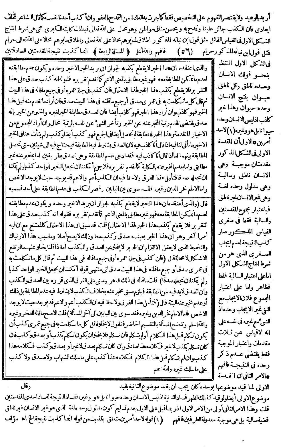 (الْمَسْأَلَةُ الرَّابِعَةُ) إنَّمَا كَذَبَتْ نَتِيجَةُ الْمُقَدِّمَتَيْنِ الصَّادِقَتَيْنِ فِي الشَّكْلِ الْأَوَّلِ الْمُنْتَظِمِ بِنَحْوِ قَوْلِكَ الْإِنْسَانُ وَحْدَهُ نَاطِقٌ، وَكُلُّ نَاطِقٍ حَيَوَانٌ يَنْتِجُ الْإِنْسَانُ وَحْدَهُ حَيَوَانٌ وَهَذَا خَبَرٌ كَاذِبٌ إذْ لَيْسَ الْإِنْسَانُ وَحْدَهُ حَيَوَانًا بَلْ هُوَ وَغَيْرُهُ لِأَحَدِ أَمْرَيْنِ