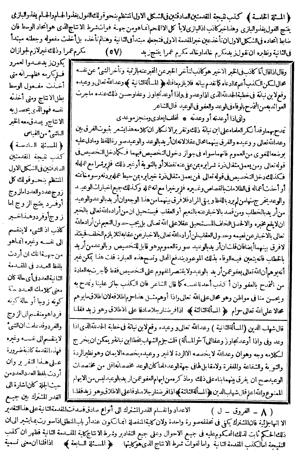 (الْمَسْأَلَةُ الثَّانِيَةُ) وَعْدُ اللَّهِ تَعَالَى وَوَعِيدُهُ وَقَعَ لِابْنِ نَبَاتَةَ فِي خُطْبَةٍ " الْحَمْدُ لِلَّهِ الَّذِي إذَا وَعَدَ وَفَى وَإِذَا أَوْعَدَ تَجَاوَزَ وَعَفَا " وَحَسُنَ ذَلِكَ عِنْدَهُ مَا جَرَتْ الْعَوَائِدُ بِهِ مِنْ التَّمَدُّحِ بِالْوَفَاءِ فِي الْوَعْدِ وَالْعَفْوِ فِي الْوَعِيدِ.