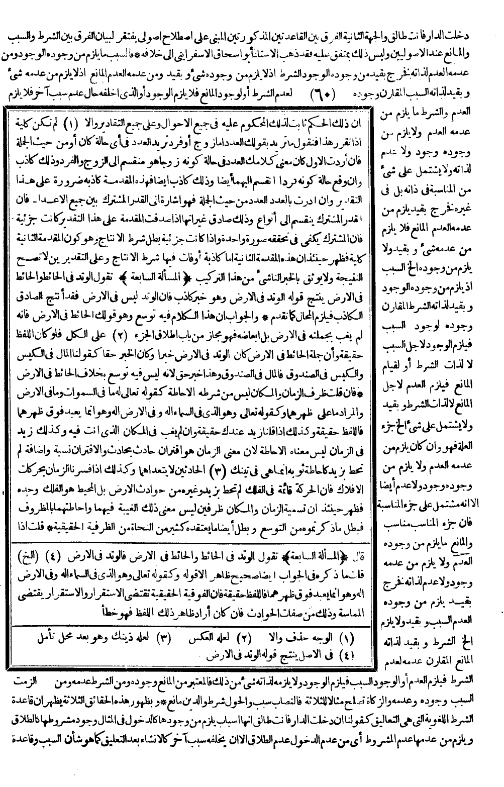 (الْمَسْأَلَةُ السَّابِعَةُ) تَقُولُ الْوَتَدُ فِي الْحَائِطِ وَالْحَائِطُ فِي الْأَرْضِ يَنْتِجُ قَوْلُهُ الْوَتَدُ فِي الْأَرْضِ وَهُوَ خَبَرٌ كَاذِبٌ، فَإِنَّ الْوَتَدَ لَيْسَ فِي الْأَرْضِ فَقَدْ أَنْتَجَ الصَّادِقُ الْكَاذِبَ فَيَلْزَمُ الْمُحَالُ كَمَا تَقَدَّمَ.