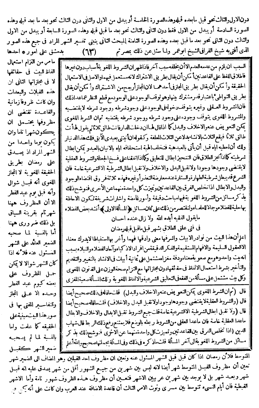(الْمَسْأَلَةُ الْأُولَى) أَنْشَدَ بَعْضُ الْفُضَلَاءِ مَا يَقُولُ الْفَقِيهُ أَيَّدَهُ اللَّهُ: وَلَا زَالَ عِنْدَهُ إحْسَانٌ فِي فَتًى عَلَّقَ الطَّلَاقَ بِشَهْرٍ قَبْلَ مَا قَبْلَ قَبْلِهِ رَمَضَانُ اعْلَمْ أَنَّ هَذَا الْبَيْتَ مِنْ نَوَادِرِ الْأَبْيَاتِ وَأَشْرَفِهَا مَعْنًى وَأَدَقِّهَا فَهْمًا وَأَغْرَبِهَا اسْتِنْبَاطًا لَا يُدْرِكُ مَعْنَاهُ إلَّا الْعُقُولُ السَّلِيمَةُ وَالْأَفْهَامُ الْمُسْتَقِيمَةُ وَالْفِكَرُ الدَّقِيقَةُ مِنْ أَفْرَادِ الْأَذْكِيَاءِ وَآحَادِ الْفُضَلَاءِ وَالنُّبَلَاءِ بِسَبَبِ أَنَّهُ بَيْتٌ وَاحِدٌ وَهُوَ مَعَ صُعُوبَةِ مَعْنَاهُ وَدِقَّةِ مَغْزَاهُ مُشْتَمِلٌ عَلَى ثَمَانِيَةِ أَبْيَاتٍ فِي الْإِنْشَادِ بِالتَّغْيِيرِ وَالتَّقْدِيمِ وَالتَّأْخِيرِ بِشَرْطِ اسْتِعْمَالِ الْأَلْفَاظِ فِي حَقَائِقِهَا دُونَ مُجَازَاتِهَا مَعَ الْتِزَامِ صِحَّةِ الْوَزْنِ عَلَى الْقَانُونِ اللُّغَوِيِّ وَكُلُّ بَيْتٍ مُشْتَمِلٌ عَلَى مَسْأَلَةٍ مِنْ الْفِقْهِ فِي التَّعَالِيقِ الشَّرْعِيَّةِ وَالْأَلْفَاظِ اللُّغَوِيَّةِ وَتِلْكَ الْمَسْأَلَةُ صَعْبَةُ الْمَغْزَى.