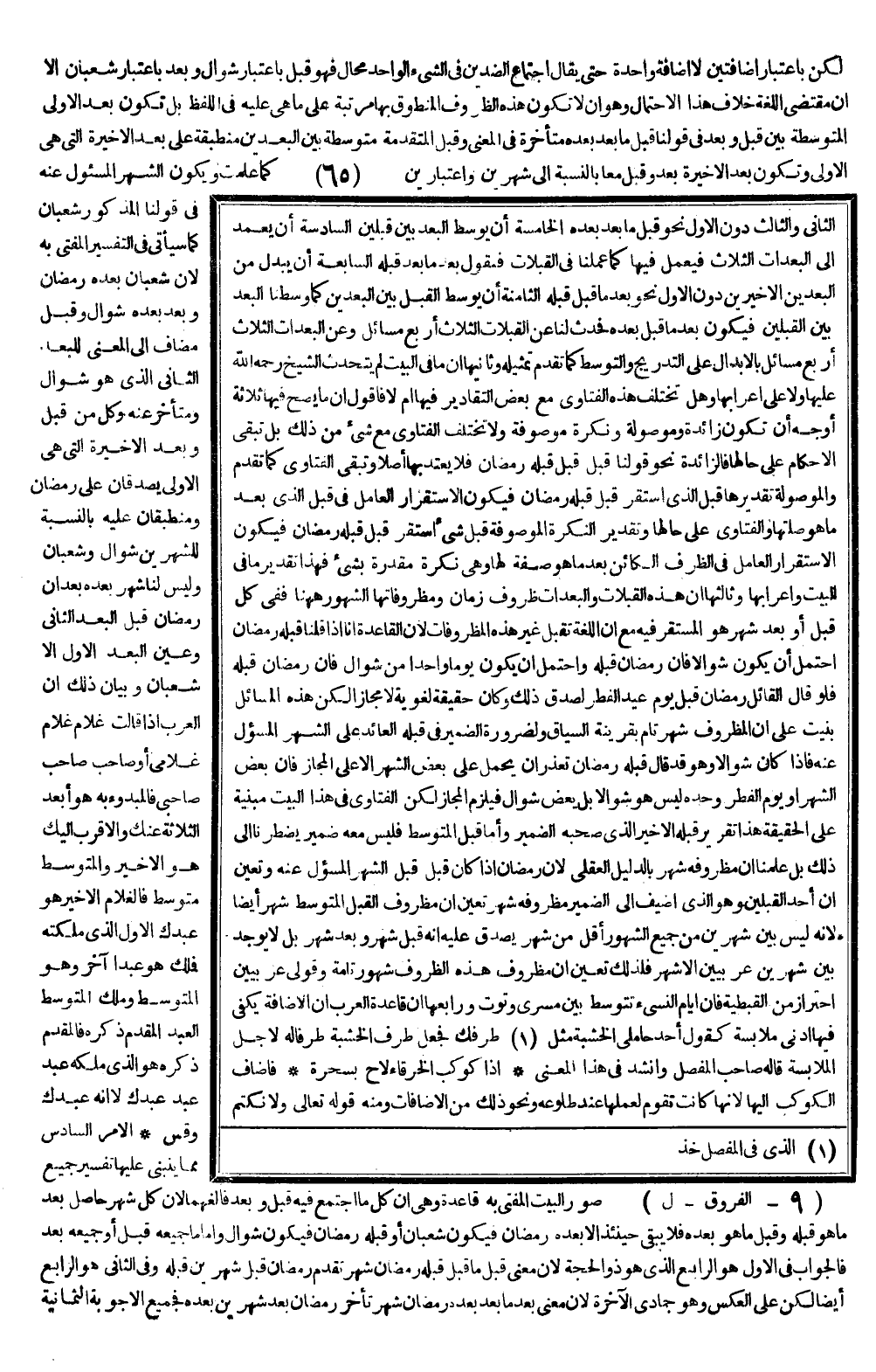 وَثَالِثُهَا أَنَّ هَذِهِ الْقَبْلَاتِ وَالْبَعْدَاتِ ظُرُوفُ زَمَانٍ وَمَظْرُوفَاتُهَا الشُّهُور هَاهُنَا فَفِي كُلٍّ قَبْلُ أَوْ بَعْدُ شَهْرٌ هُوَ الْمُسْتَقِرُّ فِيهِ مَعَ أَنَّ اللُّغَةَ تَقْبَلُ غَيْرَ هَذِهِ الْمَظْرُوفَاتِ لِأَنَّ الْقَاعِدَةَ أَنَّا إذَا قُلْنَا قَبْلَهُ رَمَضَانُ احْتَمَلَ أَنْ يَكُونَ شَوَّالًا فَإِنَّ رَمَضَانَ قَبْلَهُ وَاحْتَمَلَ أَنْ يَكُونَ يَوْمًا وَاحِدًا مِنْ شَوَّالٍ فَإِنَّ رَمَضَانَ قَبْلَهُ فَلَوْ قَالَ الْقَائِلُ: رَمَضَانُ قَبْلَ يَوْمِ عِيدِ الْفِطْرِ لَصَدَقَ ذَلِكَ وَكَانَ حَقِيقَةً لُغَوِيَّةً لَا مَجَازًا لَكِنْ هَذِهِ الْمَسَائِلَ بُنِيَتْ عَلَى أَنَّ الْمَظْرُوفَ شَهْرٌ تَامٌّ بِقَرِينَةِ السِّيَاقِ وَلِضَرُورَةِ الضَّمِيرِ فِي قَبْلِهِ الْعَائِدِ عَلَى الشَّهْرِ الْمَسْئُولِ عَنْهُ فَإِذَا كَانَ شَوَّالًا وَهُوَ قَدْ قَالَ قَبْلَهُ رَمَضَانُ تَعَذَّرَ أَنْ يُحْمَلَ عَلَى بَعْضِ الشَّهْرِ إلَّا عَلَى الْمَجَازِ فَإِنَّ بَعْضَ الشَّهْرِ أَوْ يَوْمَ الْفِطْرِ وَحْدَهُ لَيْسَ هُوَ شَوَّالًا بَلْ بَعْضَ شَوَّالٍ فَيَلْزَمُ الْمَجَازُ لَكِنَّ الْفَتَاوَى فِي هَذَا الْبَيْتِ مَبْنِيَّةٌ عَلَى الْحَقِيقَةِ هَذَا تَقْرِيرُ قَبْلِهِ الْأَخِيرِ الَّذِي صَحِبَهُ الضَّمِيرُ وَأَمَّا قَبْلَ الْمُتَوَسِّطُ فَلَيْسَ مَعَهُ ضَمِيرٌ يَضْطَرُّنَا إلَى ذَلِكَ بَلْ عَلِمْنَا أَنَّ مَظْرُوفَهُ شَهْرٌ بِالدَّلِيلِ الْعَقْلِيِّ لِأَنَّ رَمَضَانَ إذَا كَانَ قَبْلَ قَبْلَ الشَّهْرِ الْمَسْئُولِ عَنْهُ وَتَعَيَّنَ أَنَّ أَحَدَ الْقَبْلَيْنِ وَهُوَ الَّذِي أُضِيفَ إلَى الضَّمِيرِ مَظْرُوفُهُ شَهْرٌ تَعَيَّنَ أَنَّ مَظْرُوفَ الْقَبْلِ الْمُتَوَسِّطِ شَهْرٌ أَيْضًا لِأَنَّهُ لَيْسَ بَيْنَ شَهْرَيْنِ مِنْ جَمِيعِ الشُّهُورِ أَقَلُّ مِنْ شَهْرٍ يَصْدُقُ عَلَيْهِ أَنَّهُ قَبْلَ شَهْرٍ وَبَعْدَ شَهْرٍ بَلْ لَا يُوجَدُ بَيْنَ شَهْرَيْنِ عَرَبِيَّيْنِ إلَّا شَهْرٌ فَلِذَلِكَ تَعَيَّنَ أَنَّ مَظْرُوفَ هَذِهِ الظُّرُوفِ شُهُورٌ تَامَّةٌ وَقَوْلِي عَرَبِيَّيْنِ احْتِرَازٌ مِنْ الْقِبْطِيَّةِ فَإِنَّ أَيَّامَ النَّسِيءِ تَتَوَسَّطُ بَيْنَ مِسْرَى وَتُوتٍ وَرَابِعُهَا أَنَّ قَاعِدَةَ الْعَرَبِ أَنَّ الْإِضَافَةَ يَكْفِي فِيهَا أَدْنَى مُلَابَسَةٍ كَقَوْلِ أَحَدِ حَامِلَيْ الْخَشَبَةِ مِثْلَ طَرَفَك فَجَعَلَ طَرَفَ الْخَشَبَةِ طَرَفًا لَهُ لِأَجْلِ الْمُلَابَسَةِ قَالَهُ صَاحِبُ الْمُفَصَّلِ وَأَنْشَدَ فِي هَذَا الْمَعْنَى: