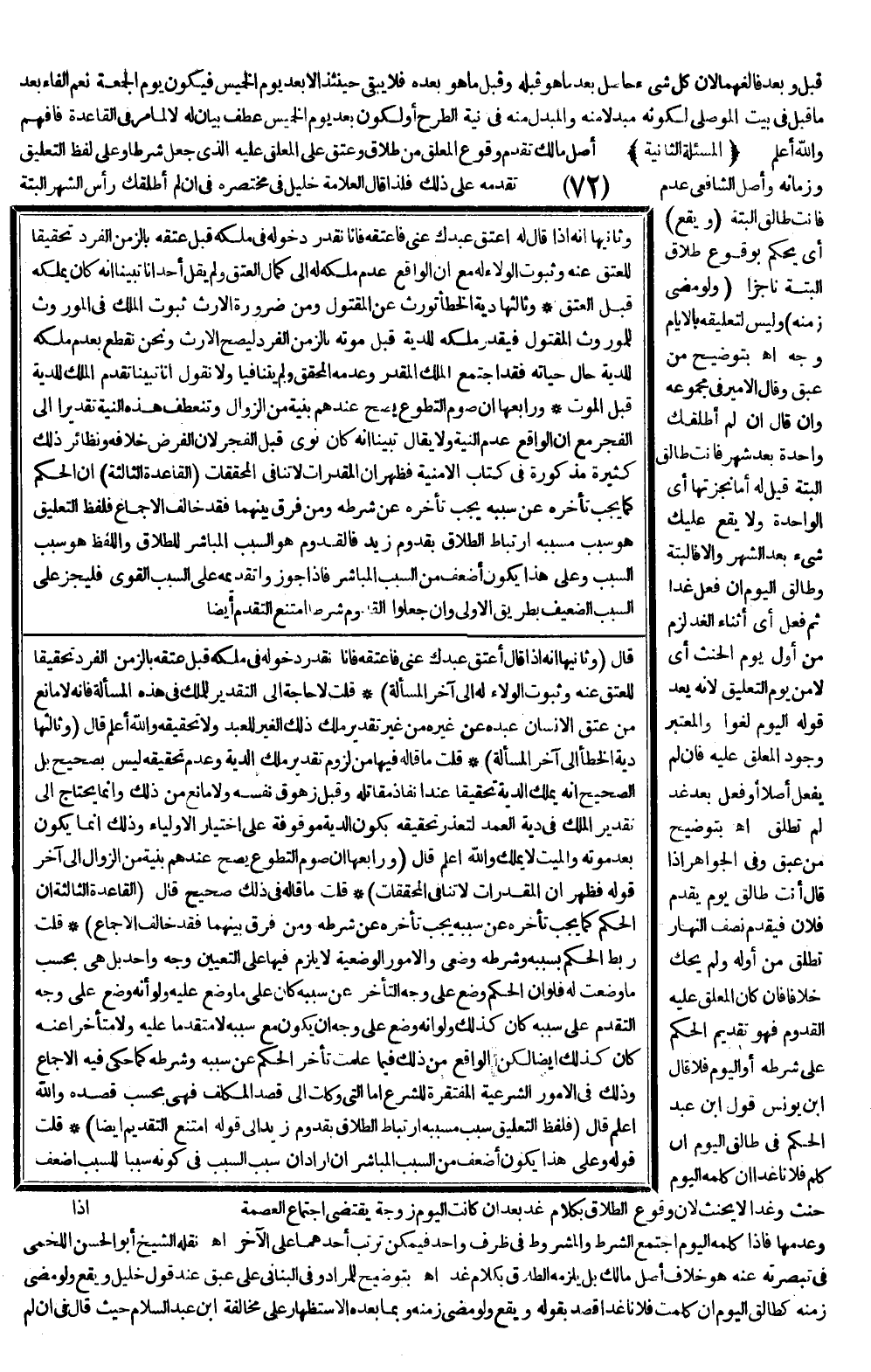(الْمَسْأَلَةُ الثَّانِيَةُ) أَصْلُ مَالِكٍ تَقَدَّمَ وُقُوعُ الْمُعَلَّقِ مِنْ طَلَاقٍ وَعِتْقٍ عَلَى الْمُعَلَّقِ عَلَيْهِ الَّذِي جُعِلَ شَرْطًا وَعَلَى لَفْظِ التَّعْلِيقِ وَزَمَانِهِ وَأَصْلُ الشَّافِعِيِّ عَدَمُ تَقَدُّمِهِ عَلَى ذَلِكَ فَلِذَا قَالَ الْعَلَّامَةُ خَلِيلٌ فِي مُخْتَصَرِهِ فِي إنْ لَمْ أُطَلِّقْك رَأْسَ الشَّهْرِ أَلْبَتَّةَ فَأَنْتِ طَالِقٌ أَلْبَتَّةَ (وَيَقَعُ) أَيْ يُحْكَمُ بِوُقُوعِ طَلَاقِ أَلْبَتَّةَ نَاجِزًا (وَلَوْ مَضَى زَمَنُهُ) وَلَيْسَ لِتَعْلِيقِهِ بِالْأَيَّامِ وَجْهٌ اهـ بِتَوْضِيحٍ مِنْ عبق.