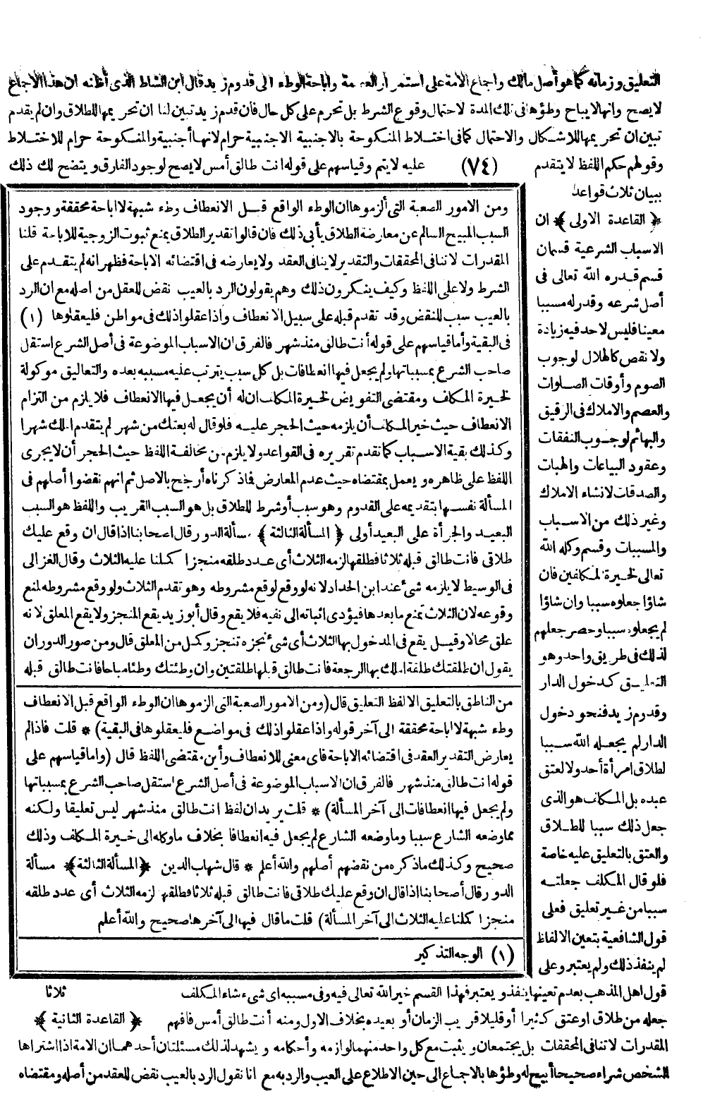 (الْقَاعِدَةُ الْأُولَى) أَنَّ الْأَسْبَابَ الشَّرْعِيَّةَ قِسْمَانِ: قِسْمٌ قَدَّرَهُ اللَّهُ تَعَالَى فِي أَصْلِ شَرْعِهِ وَقَدَّرَ لَهُ مُسَبَّبًا مُعَيَّنًا فَلَيْسَ لِأَحَدٍ فِيهِ زِيَادَةٌ وَلَا نَقْصٌ كَالْهِلَالِ لِوُجُوبِ الصَّوْمِ وَأَوْقَاتِ الصَّلَوَاتِ وَالْعِصَمِ وَالْأَمْلَاكِ فِي الرَّقِيقِ وَالْبَهَائِمِ لِوُجُوبِ النَّفَقَاتِ وَعُقُودِ الْبِيَاعَاتِ وَالْهِبَاتِ وَالصَّدَقَاتِ لِإِنْشَاءِ الْأَمْلَاكِ وَغَيْرِ ذَلِكَ مِنْ الْأَسْبَابِ وَالْمُسَبَّبَاتِ، وَقِسْمٌ وَكَّلَهُ اللَّهُ تَعَالَى لِخِيرَةِ الْمُكَلَّفِينَ فَإِنْ شَاءَا جَعَلُوهُ سَبَبًا وَإِنْ شَاءَا لَمْ يَجْعَلُوهُ سَبَبًا وَحُصِرَ جَعْلُهُمْ لِذَلِكَ فِي طَرِيقٍ وَاحِدٍ وَهُوَ التَّعْلِيقُ كَدُخُولِ الدَّارِ وَقُدُومِ زَيْدٍ فَنَحْوُ دُخُولِ الدَّارِ لَمْ يَجْعَلْهُ اللَّهُ سَبَبًا لِطَلَاقِ امْرَأَةِ أَحَدٍ وَلَا لِعِتْقِ عَبْدِهِ بَلْ الْمُكَلَّفُ هُوَ الَّذِي جَعَلَ ذَلِكَ سَبَبًا لِلطَّلَاقِ وَالْعِتْقِ بِالتَّعْلِيقِ عَلَيْهِ خَاصَّةً فَلَوْ قَالَ الْمُكَلَّفُ جَعَلْتُهُ سَبَبًا مِنْ غَيْرِ تَعْلِيقٍ فَعَلَى قَوْلِ الشَّافِعِيَّةِ بِتَعَيُّنِ الْأَلْفَاظِ لَمْ يَنْفُذْ ذَلِكَ وَلَمْ يُعْتَبَرْ وَعَلَى قَوْلِ أَهْلِ الْمَذْهَبِ بِعَدَمِ تَعَيُّنِهَا يَنْفُذُ وَيُعْتَبَرُ فَهَذَا الْقِسْمُ خَيَّرَ اللَّهُ تَعَالَى فِيهِ وَفِي مُسَبَّبِهِ أَيَّ شَيْءٍ شَاءَ الْمُكَلَّفُ جَعَلَهُ مِنْ طَلَاقٍ أَوْ عِتْقٍ كَثِيرًا أَوْ قَلِيلًا قَرِيبَ الزَّمَانِ أَوْ بَعِيدَهُ بِخِلَافِ الْأَوَّلِ وَمِنْهُ أَنْتِ طَالِقٌ أَمْسِ فَافْهَمْ.