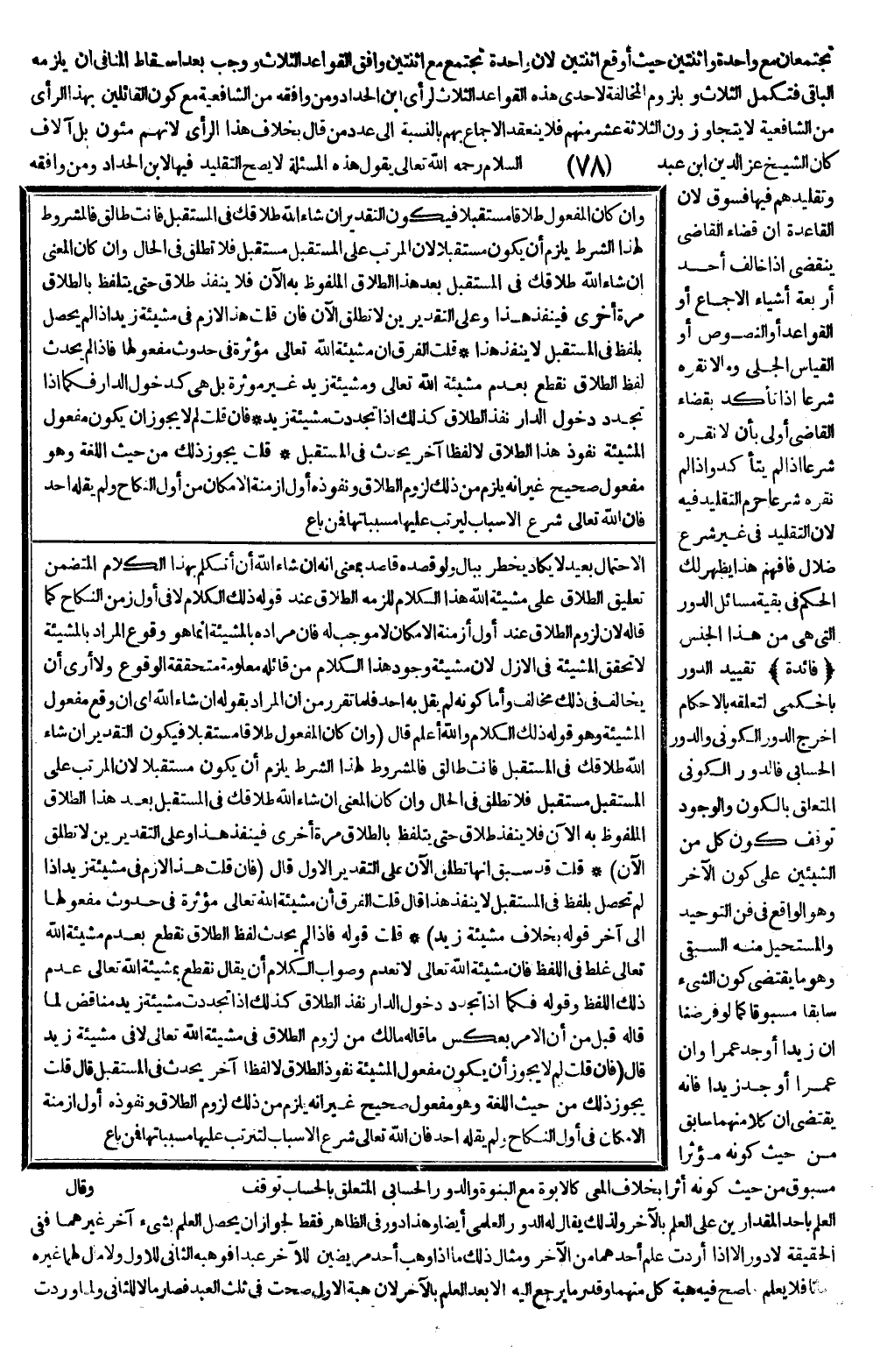 ـــــــــــــــــــــــــــــSالِاحْتِمَالَ بَعِيدٌ لَا يَكَادُ يَخْطِرُ بِبَالٍ وَلَوْ قَصَدَهُ بِمَعْنَى أَنَّهُ إنْ شَاءَ اللَّهُ أَنْ أَتَكَلَّمَ بِهَذَا الْكَلَامِ الْمُتَضَمِّنِ تَعْلِيقَ الطَّلَاقِ عَلَى مَشِيئَةِ اللَّهِ هَذَا الْكَلَامُ لَلَزِمَهُ الطَّلَاقُ عِنْدَ قَوْلِهِ ذَلِكَ الْكَلَامَ لَا فِي أَوَّلِ زَمَنِ النِّكَاحِ كَمَا قَالَهُ لِأَنَّ لُزُومَ الطَّلَاقِ عِنْدَ أَوَّلِ أَزْمِنَةِ الْإِمْكَانِ لَا مُوجِبَ لَهُ فَإِنَّ مُرَادَهُ بِالْمَشِيئَةِ إنَّمَا هُوَ وُقُوعُ الْمُرَادُ بِالْمَشِيئَةِ لَا تَحَقُّقُ الْمَشِيئَةِ فِي الْأَزَلِ لِأَنَّ مَشِيئَةَ وُجُودِ هَذَا الْكَلَامِ مِنْ قَائِلِهِ مَعْلُومَةٌ مُتَحَقِّقَةُ الْوُقُوعِ وَلَا أَرَى أَنْ يُخَالِفَ فِي ذَلِكَ مُخَالِفٌ وَأَمَّا كَوْنُهُ لَمْ يَقُلْ بِهِ أَحَدٌ فَلِمَا تَقَرَّرَ مِنْ أَنَّ الْمُرَادَ بِقَوْلِهِ إنْ شَاءَ اللَّهُ أَيْ إنْ وَقَعَ مَفْعُولُ الْمَشِيئَةِ وَهُوَ قَوْلُهُ ذَلِكَ الْكَلَامَ وَاَللَّهُ أَعْلَمُ.