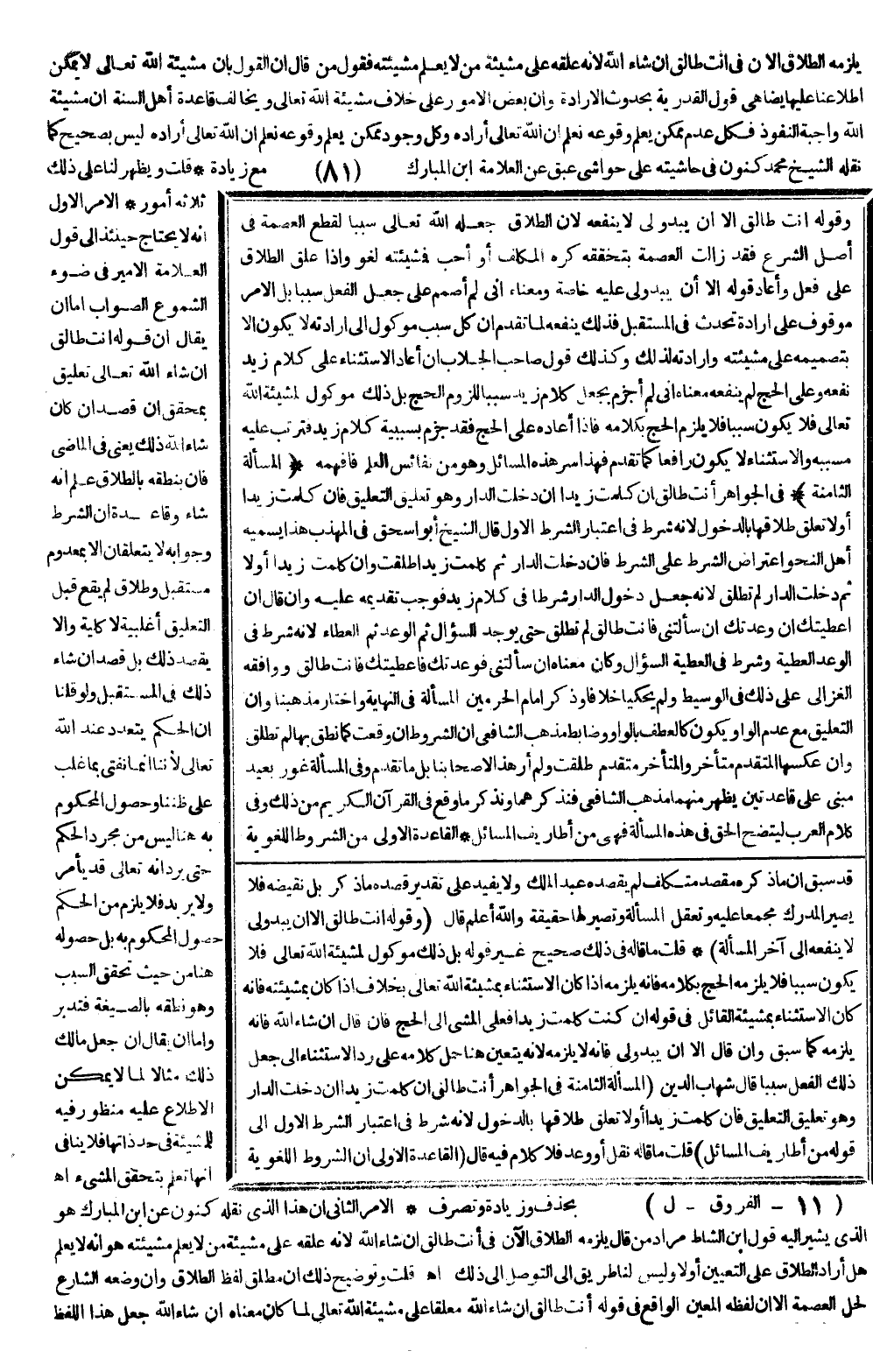 ـــــــــــــــــــــــــــــQيَلْزَمُهُ الطَّلَاقُ الْآنَ فِي أَنْتِ طَالِقٌ إنْ شَاءَ اللَّهُ لِأَنَّهُ عَلَّقَهُ عَلَى مَشِيئَةِ مَنْ لَا يَعْلَمُ مَشِيئَتَهُ فَقَوْلُ مَنْ قَالَ: إنَّ الْقَوْلَ بِأَنَّ مَشِيئَةَ اللَّهِ تَعَالَى لَا يُمْكِنُ اطِّلَاعُنَا عَلَيْهَا يُضَاهِي قَوْلَ الْقَدَرِيَّةِ بِحُدُوثِ الْإِرَادَةِ وَأَنَّ بَعْضَ الْأُمُورِ عَلَى خِلَافِ مَشِيئَةِ اللَّهِ تَعَالَى وَيُخَالِفُ قَاعِدَةَ أَهْلِ السُّنَّةِ أَنَّ مَشِيئَةَ اللَّهِ وَاجِبَةُ النُّفُوذِ فَكُلُّ عَدَمٍ مُمْكِنٌ يُعْلَمُ وُقُوعُهُ نَعْلَمُ أَنَّ اللَّهَ تَعَالَى أَرَادَهُ وَكُلُّ وُجُودٍ مُمْكِنٍ يُعْلَمُ وُقُوعُهُ نَعْلَمُ أَنَّ اللَّهَ تَعَالَى أَرَادَهُ لَيْسَ بِصَحِيحٍ كَمَا نَقَلَهُ الشَّيْخُ مُحَمَّدٌ كَنُونِ فِي حَاشِيَتِهِ عَلَى حَوَاشِي عبق عَنْ الْعَلَّامَةِ ابْنِ الْمُبَارَكِ مَعَ زِيَادَةٍ قُلْتُ: وَيَظْهَرُ لَنَا عَلَى ذَلِكَ ثَلَاثَةُ أُمُورٍ: الْأَمْرُ الْأَوَّلُ أَنَّهُ لَا يَحْتَاجُ حِينَئِذٍ إلَى قَوْلِ الْعَلَّامَةِ الْأَمِيرِ فِي ضَوْءِ الشُّمُوعِ الصَّوَابُ إمَّا أَنْ يُقَالَ: إنَّ قَوْلَهُ أَنْتِ طَالِقٌ إنْ شَاءَ اللَّهُ تَعَالَى تَعْلِيقٌ بِمُحَقَّقٍ إنْ قُصِدَ إنْ كَانَ شَاءَ اللَّهُ ذَلِكَ يَعْنِي فِي الْمَاضِي فَإِنَّ بِنُطْقِهِ بِالطَّلَاقِ عُلِمَ أَنَّهُ شَاءَ وَقَاعِدَةُ أَنَّ الشَّرْطَ وَجَوَابَهُ لَا يَتَعَلَّقَانِ إلَّا بِمَعْدُومٍ مُسْتَقْبَلٍ وَطَلَاقٍ لَمْ يَقَعْ قَبْلَ التَّعْلِيقِ أَغْلَبِيَّةٌ لَا كُلِّيَّةٌ وَإِلَّا يَقْصِدْ ذَلِكَ بَلْ قَصَدَ إنْ شَاءَ ذَلِكَ فِي الْمُسْتَقْبَلِ وَلَوْ قُلْنَا: إنَّ الْحُكْمَ يَتَعَدَّدُ عِنْدَ اللَّهِ تَعَالَى لِأَنَّنَا إنَّمَا نُفْتِي بِمَا غَلَبَ عَلَى ظَنِّنَا وَحُصُولُ الْمَحْكُومِ بِهِ هُنَا لَيْسَ مِنْ مُجَرَّدِ الْحُكْمِ حَتَّى يَرِدَ أَنَّهُ تَعَالَى قَدْ يَأْمُرُ وَلَا يُرِيدُ فَلَا يَلْزَمُ مِنْ الْحُكْمِ حُصُولُ الْمَحْكُومِ بِهِ بَلْ حُصُولُهُ هُنَا مِنْ حَيْثُ تَحَقُّقِ السَّبَبِ وَهُوَ نُطْقُهُ بِالصِّيغَةِ فَتَدَبَّرْ.