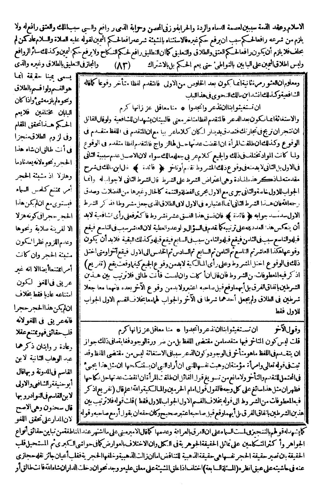وَإِذَا كَانَ الْبَابَانِ مُخْتَلِفَيْنِ فَلَا يَعُمُّ الْحُكْمُ هَذَا تَحَقُّقُ الْمَقَامِ وَفِي لُزُومِ الطَّلَاقِ مُنَجَّزًا فِي أَنْتِ طَالِقٌ إنْ شَاءَ هَذَا الْحَجَرُ وَنَحْوُهُ لِأَنَّهُ يُعَدُّ نَادِمًا وَهَازِلًا إذْ مَشِيئَةُ الْحَجَرِ أَمْرٌ مُمْتَنِعٌ كَلَمْسِ السَّمَاءِ فَيَسْتَوِي مَعَ إنْ لَمْ يَكُنْ هَذَا الْحَجَرُ حَجَرًا فِي كَوْنِهِ هَزْلًا إلَّا لِقَرِينَةِ صَلَابَةٍ وَنَحْوِهَا وَعَدَمُ اللُّزُومِ نَظَرًا لِكَوْنِ مَشِيئَةِ الْحَجَرِ وَإِنْ كَانَتْ أَمْرًا مُمْتَنِعًا أَيْضًا إلَّا أَنَّهُ غَيْرُ عَرِيقٍ فِي اللَّغْوِ لِكَوْنِ امْتِنَاعِهِ عَادِيًا فَقَطْ بِخِلَافِ إنْ لَمْ يَكُنْ هَذَا الْحَجَرُ حَجَرًا فَإِنَّهُ عَرِيقٌ فِي اللَّغْوِ لِأَنَّهُ قَلْبُ حَقَائِقَ فَهُوَ مُمْتَنِعٌ عَقْلًا وَعَادَةً رِوَايَتَانِ ذَكَرَهُمَا عَبْدُ الْوَهَّابِ الثَّانِيَةُ لِابْنِ الْقَاسِمِ فِي الْمُدَوَّنَةِ وَبِهَا قَالَ أَبُو حَنِيفَةَ وَالشَّافِعِيُّ وَالْأُولَى لِابْنِ الْقَاسِمِ فِي النَّوَادِرِ وَبِهَا قَالَ سَحْنُونٌ وَهِيَ الْأَصَحُّ لِأَنَّ الْمَدَارَ عَلَى تَحَقُّقِ اللَّغْوِ كَمَا يَشْهَدُ لَهُ قَوْلُهُمْ بِالتَّنْجِيزِ فِي لَمَسْت السَّمَاءَ عَلَى أَنَّ الْفَرْقَ بِالْعَرَاقَةِ وَعَدَمِهَا كَمَا قَالَ الْأَمِيرُ مَبْنِيٌّ عَلَى مَا اشْتَهَرَ عِنْدَ الْمَنَاطِقَةِ مِنْ تَبَايُنِ حَقَائِقِ أَنْوَاعِ الْجَوَاهِرِ وَأَكْثَرُ الْمُتَكَلِّمِينَ عَلَى تَمَاثُلِ الْحَقِيقَةِ الْجَوْهَرِيَّةِ فِي الْكُلِّ وَأَنَّ الِاخْتِلَافَ بِالْعَوَارِضِ كَمَا فِي حَوَاشِي الْكُبْرَى ثُمَّ الْمُسْتَحِيلُ قَلْبُ الْحَقِيقَةِ بِأَنْ تَصِيرَ حَقِيقَةُ الْحَجَرِ نَفْسُهَا هِيَ حَقِيقَةُ الذَّهَبِيَّةِ لِلتَّنَاقُضِ أَمَّا إنْ زَالَتْ الذَّهَبِيَّةُ وَخَلَفَهَا الْحَجَرِيَّةُ فَقَلْبُ أَعْيَانٍ جَائِزٌ نَقَلَهُ حِجَازِيٌّ عَنْهُ فِي حَاشِيَتِهِ عَلَى عبق اُنْظُرْهُ.