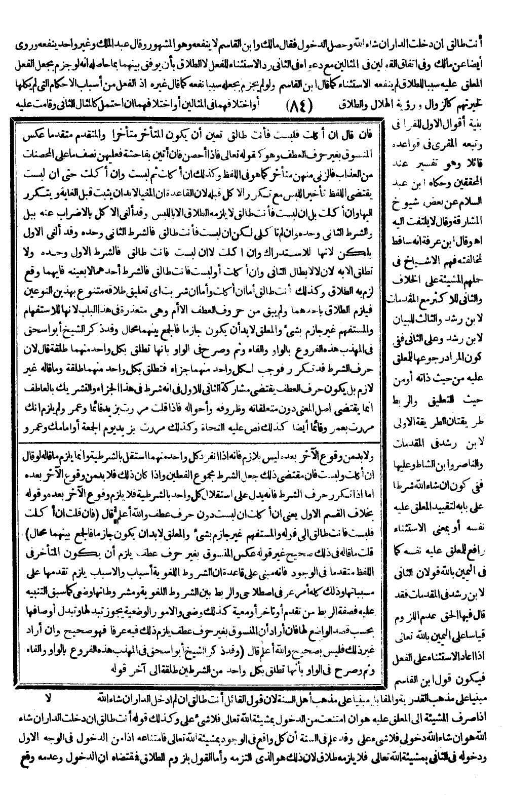 وَقَالَ ابْنُ عَرَفَةَ: إنَّهُ سَاقِطٌ لِمُخَالَفَتِهِ فَهْمَ الْأَشْيَاخِ فِي حَمْلِهِمْ الْمَشِيئَةَ عَلَى الْخِلَافِ وَالثَّانِي لِلْأَكْثَرِ مَعَ الْمُقَدِّمَاتِ لِابْنِ رُشْدٍ وَالثَّالِثُ لِلْبَيَانِ لِابْنِ رُشْدٍ وَعَلَى الثَّانِي فَفِي كَوْنِ الْمُرَادِ رُجُوعُهَا لِلْمُعَلَّقِ عَلَيْهِ مِنْ حَيْثُ ذَاتُهَ أَوْ مِنْ حَيْثُ التَّعْلِيقُ وَالرَّبْطُ طَرِيقَتَانِ: الطَّرِيقَةُ الْأُولَى لِابْنِ رُشْدٍ فِي الْمُقَدِّمَاتِ وَالنَّاصِرِ وَابْنِ الشَّاطِّ وَعَلَيْهَا فَفِي كَوْنِ إنْ شَاءَ اللَّهُ شَرْطًا عَلَى بَابِهِ لِتَقْيِيدِ الْمُعَلَّقِ عَلَيْهِ نَفْسِهِ أَوْ بِمَعْنَى الِاسْتِثْنَاءِ رَافِعٌ لِلْمُعَلَّقِ عَلَيْهِ نَفْسِهِ كَمَا فِي الْيَمِينِ بِاَللَّهِ قَوْلَانِ الثَّانِي لِابْنِ رُشْدٍ فِي الْمُقَدِّمَاتِ فَقَدْ قَالَ فِيهَا الْحَقُّ عَدَمُ اللُّزُومِ قِيَاسًا عَلَى الْيَمِينِ بِاَللَّهِ تَعَالَى إذَا أَعَادَ الِاسْتِثْنَاءَ عَلَى الْفِعْلِ فَيَكُونُ قَوْلُ ابْنِ الْقَاسِمِ مَبْنِيًّا عَلَى مَذْهَبِ الْقَدَرِيَّةِ وَالْمُقَابِلُ مَبْنِيًّا عَلَى مَذْهَبِ أَهْلِ السُّنَّةِ لِأَنَّ قَوْلَ الْقَائِلِ أَنْتِ طَالِقٌ إنْ لَمْ أَدْخُلْ الدَّارَ إنْ شَاءَ اللَّهُ إذَا صَرَفَ الْمَشِيئَةَ إلَى الْمُعَلَّقِ عَلَيْهِ هُوَ إنْ امْتَنَعْت مِنْ الدُّخُولِ بِمَشِيئَةِ اللَّهِ تَعَالَى فَلَا شَيْءَ عَلَيَّ وَكَذَلِكَ قَوْلُهُ أَنْتِ طَالِقٌ إنْ دَخَلْت الدَّارَ إنْ شَاءَ اللَّهُ هُوَ إنْ شَاءَ اللَّهُ دُخُولِي فَلَا شَيْءَ عَلَيَّ وَقَدْ عُلِمَ فِي السُّنَّةِ أَنَّ كُلَّ وَاقِعٍ فِي الْوُجُودِ بِمَشِيئَةِ اللَّهِ تَعَالَى فَامْتِنَاعُهُ إذًا مِنْ الدُّخُولِ فِي الْوَجْهِ الْأَوَّلِ وَدُخُولُهُ فِي الثَّانِي بِمَشِيئَةِ اللَّهِ تَعَالَى فَلَا يَلْزَمُهُ طَلَاقٌ لِأَنَّ ذَلِكَ هُوَ الَّذِي الْتَزَمَهُ وَأَمَّا الْقَوْلُ بِلُزُومِ الطَّلَاقِ فَمُقْتَضَاهُ أَنَّ الدُّخُولَ وَعَدَمَهُ وَقَعَ.