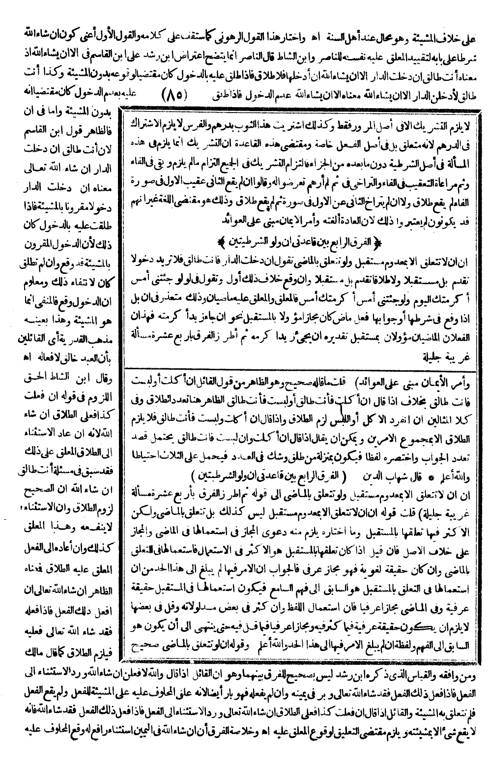 ـــــــــــــــــــــــــــــQعَلَى خِلَافِ الْمَشِيئَةِ وَهُوَ مُحَالٌ عِنْدَ أَهْلِ السُّنَّةِ اهـ وَاخْتَارَ هَذَا الْقَوْلَ الرَّهُونِيُّ كَمَا سَتَقِفُ عَلَى كَلَامِهِ وَالْقَوْلُ الْأَوَّلُ أَعْنِي كَوْنَ إنْ شَاءَ اللَّهُ شَرْطًا عَلَى بَابِهِ لِتَقْيِيدِ الْمُعَلَّقِ عَلَيْهِ نَفْسِهِ لِلنَّاصِرِ وَابْنِ الشَّاطِّ قَالَ النَّاصِرُ: إنَّمَا يَتَّضِحُ اعْتِرَاضُ ابْنِ رُشْدٍ عَلَى ابْنِ الْقَاسِمِ فِي إلَّا أَنْ يَشَاءَ اللَّهُ إذْ مَعْنَاهُ أَنْتِ طَالِقٌ إنْ دَخَلْت الدَّارَ إلَّا أَنْ يَشَاءَ اللَّهُ أَنْ أَدْخُلَهَا فَلَا طَلَاقَ فَإِذَا طَلَّقَ عَلَيْهِ بِالدُّخُولِ كَانَ مُقْتَضِيًا لِوُقُوعِهِ بِدُونِ الْمَشِيئَةِ وَكَذَا أَنْتِ طَالِقٌ لَأَدْخُلَنَّ الدَّارَ إلَّا أَنْ يَشَاءَ اللَّهُ مَعْنَاهُ إلَّا أَنْ يَشَاءَ اللَّهُ عَدَمَ الدُّخُولِ فَإِذَا طَلَّقَ عَلَيْهِ بِعَدَمِ الدُّخُولِ كَانَ مُقْتَضِيًا أَنَّهُ بِدُونِ الْمَشِيئَةِ وَأَمَّا فِي إنْ فَالظَّاهِرُ قَوْلُ ابْنِ الْقَاسِمِ لِأَنَّ أَنْتِ طَالِقٌ إنْ دَخَلْت الدَّارَ إنْ شَاءَ اللَّهُ تَعَالَى مَعْنَاهُ إنْ دَخَلْت الدَّارَ دُخُولًا مَقْرُونًا بِالْمَشِيئَةِ فَإِذَا طَلُقَتْ عَلَيْهِ بِالدُّخُولِ كَانَ ذَلِكَ لِأَنَّ الدُّخُولَ الْمَقْرُونَ بِالْمَشِيئَةِ قَدْ وَقَعَ وَإِنْ لَمْ تَطْلُقْ كَانَ لِانْتِفَاءِ ذَلِكَ وَمَعْلُومٌ أَنَّ الدُّخُولَ وَقَعَ فَالْمَنْفِيُّ إنَّمَا هُوَ الْمَشِيئَةُ وَهَذَا بِعَيْنِهِ مَذْهَبُ الْقَدَرِيَّةِ أَيْ الْقَائِلِينَ بِأَنَّ الْعَبْدَ خَالِقٌ لِأَفْعَالِهِ اهـ.