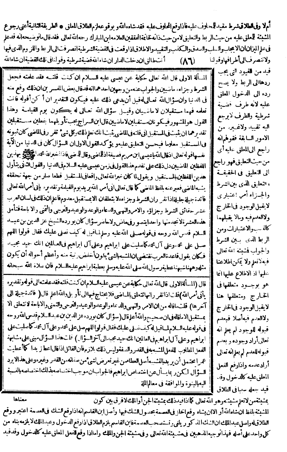 وَقَوْلُنَا فِي تِلْكَ الْقَضِيَّةِ إنْ شَاءَ اللَّهُ قَيْدٌ مِنْ الْقُيُودِ الَّتِي يَجِبُ رَدُّهَا إلَى الرَّبْطِ وَلَا يَصِحُّ رَدُّهُ إلَى الدُّخُولِ الْمُعَلَّقِ عَلَيْهِ لِأَنَّهُ طَرَفُ قَضِيَّةٍ شَرْطِيَّةٍ وَالطَّرَفُ لَا يَرْجِعُ إلَيْهِ تَقْيِيدٌ وَلَا غَيْرُهُ مِنْ الْأُمُورِ السَّابِقَةِ فَقَوْلُهُمْ أَنَّهُ رَاجِعٌ إلَى الْمُعَلَّقِ عَلَيْهِ أَيْ مِنْ حَيْثُ التَّعْلِيقُ فَهُوَ رَاجِعٌ إلَى التَّعْلِيقِ فِي الْحَقِيقَةِ وَالتَّعْلِيقُ الَّذِي بَيْنَ الشَّرْطِ وَالْجَزَاءِ أَمْرٌ اعْتِبَارِيٌّ لَا يَقْبَلُ الْوُجُودَ فِي الْخَارِجِ وَلَا الْعَدَمَ فِيهِ وَمَا لَا يَقْبَلُهُمَا كَالنَّسَبِ وَالِاعْتِبَارَاتِ وَمِنْ الرَّبْطِ الَّذِي بَيْنَ الشَّرْطِ وَالْجَوَابِ فَمَشِيئَةُ اللَّهِ تَعَالَى فِيهِ لَا تُعْلَمُ وَلَا يُمْكِنُ اطِّلَاعُنَا عَلَيْهَا إذْ الِاطِّلَاعُ عَلَيْهَا إنَّمَا هُوَ بِوُجُودِ مُتَعَلِّقِهَا فِي الْخَارِجِ وَمُتَعَلِّقُهَا هُنَا لَا يَقْبَلُ الْوُجُودَ فِي الْخَارِجِ وَلَا الْعَدَمَ فِيهِ أَصْلًا فَبِعَدَمِ قَبُولِهِ لِلْوُجُودِ لَمْ يُعْلَمْ أَنَّهُ تَعَالَى أَرَادَ وُجُودَهُ وَبِعَدَمِ قَبُولِهِ لِلْعَدَمِ لَمْ يُعْلَمْ أَنَّهُ تَعَالَى أَرَادَ عَدَمَهُ وَإِذَا وَقَعَ الْفِعْلُ الْمُعَلَّقُ عَلَيْهِ كَالدُّخُولِ وَقَدْ قَيَّدَ جَعْلَهُ سَبَبًا فِي الطَّلَاقِ بِمَشِيئَةِ مَنْ لَا تُعْلَمُ مَشِيئَتُهُ وَهُوَ اللَّهُ تَعَالَى كَمَا إذَا قَيَّدَ ذَلِكَ بِمَشِيئَةِ الْجِنِّ أَوْ الْمَلَكِ لَا فَرْقَ بَيْنَ كَوْنِ الْمَشِيئَةِ بِلَفْظِ إنْ شَاءَ اللَّهُ أَوْ إلَّا أَنْ يَشَاءَ وَقَعَ الْخَلَلُ فِي الْعِصْمَةِ بِحُصُولِ الشَّكِّ فِيهَا وَأَصْلُ ابْنِ الْقَاسِمِ أَنَّهُ إذَا وَقَعَ الشَّكُّ فِي الْعِصْمَةِ اُعْتُبِرَ وَوَقَعَ الطَّلَاقُ لَهُ وَأَصْلُ عَبْدِ الْمَلِكِ أَنَّ الشَّكَّ الْمَذْكُورَ يُلْغَى وَتُسْتَصْحَبُ الْعِصْمَةُ فَابْنُ الْقَاسِمِ يَلْزَمُ الطَّلَاقُ إذَا وَقَعَ الدُّخُولُ وَعَبْدُ الْمَلِكِ لَا يَلْزَمُهُ بِنَاءً مِنْ كُلِّ وَاحِدٍ عَلَى أَصْلِهِ فَهَذَا تَوْجِيهُ الْمَذْهَبَيْنِ فِي مَشِيئَةِ اللَّهِ تَعَالَى وَفِي مَشِيئَةِ الْجِنِّ وَالْمَلَكِ وَأَمَّا إذَا وَقَعَ الْفِعْلُ الْمُعَلَّقُ عَلَيْهِ كَالدُّخُولِ وَقَدْ قَيَّدَ