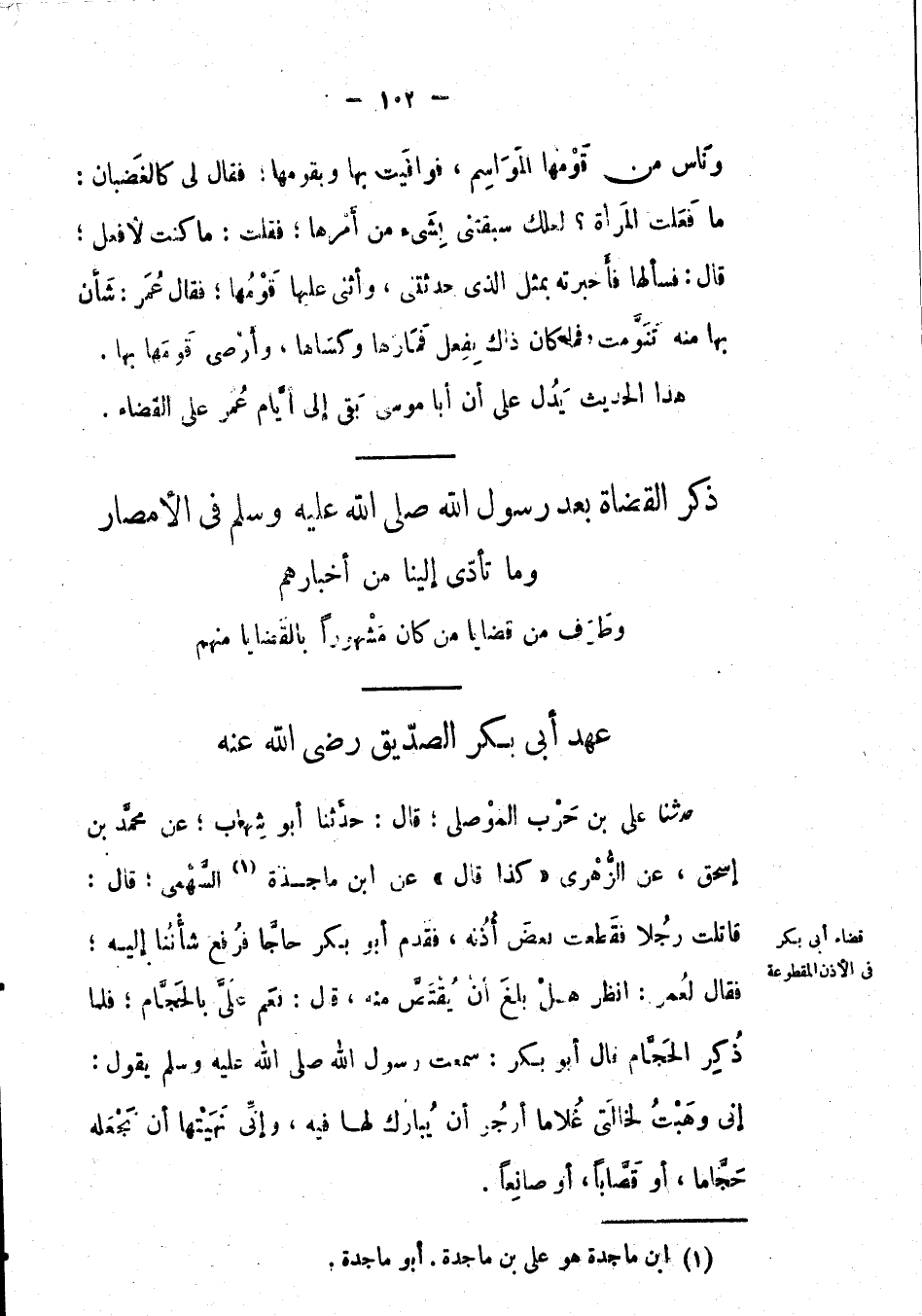 حَدَّثَنَا علي بْن حرب الموصلي؛ قال: حَدَّثَنَا أَبُو شهاب؛ عَن مُحَمَّد بْن إسحاق، عَن الزهري كذا قَالَ: عَن ابن ماجدة السهمي؛ قال: قاتلت رجلاً فقطعت بعض أذنه، فقدم أَبُو بكر حاجا فرفع شأننا إليه؛ فَقَالَ: لِعُمَرَ: انظر هَلْ بلغ أن يقتص منه، قل: نعم علي بالحجام؛ فلما ذكر الحجام قَالَ: أَبُو بكر: سَمِعْتُ رَسُوْلَ اللهِ صَلَّى اللَّهُ عَلَيْهِ وَسَلَّمَ يقول: إني وهبت لخالتي غلاما أرجو أن يبارك لها فيه، وإني نهيتها أن نجعله حجاما، أو قصاباً، أو صانعاً.