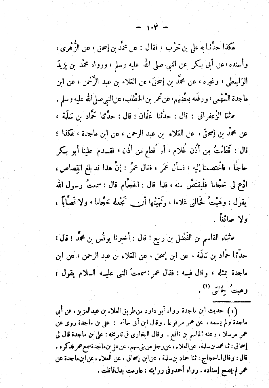 حَدَّثَنَا الزعفراني؛ قال: حَدَّثَنَا عفان؛ قال: حَدَّثَنَا حماد بْن سلمة، عَن مُحَمَّد بْن إسحاق، عَن العلاء بْن عَبْد الرحمن، عَن ابن ماجدة، هكذا؛ قال: قطعت من أذن غلام، أو قطع من أذن، فقدم علينا أَبُو بكر حاجا، فاختصمنا إليه، فسأل عُمَر، فَقَالَ عُمَرُ: إن هَذَا قد بلغ القصاص، ادع لي حجاما فليقتص منه، فلما قال: الحجام قال: سمعت رسول الله يقول: وهبت لخالتي غلاما، ونهيتها أن نجعله حجاما، ولا نصاباً، ولا صائغاً.