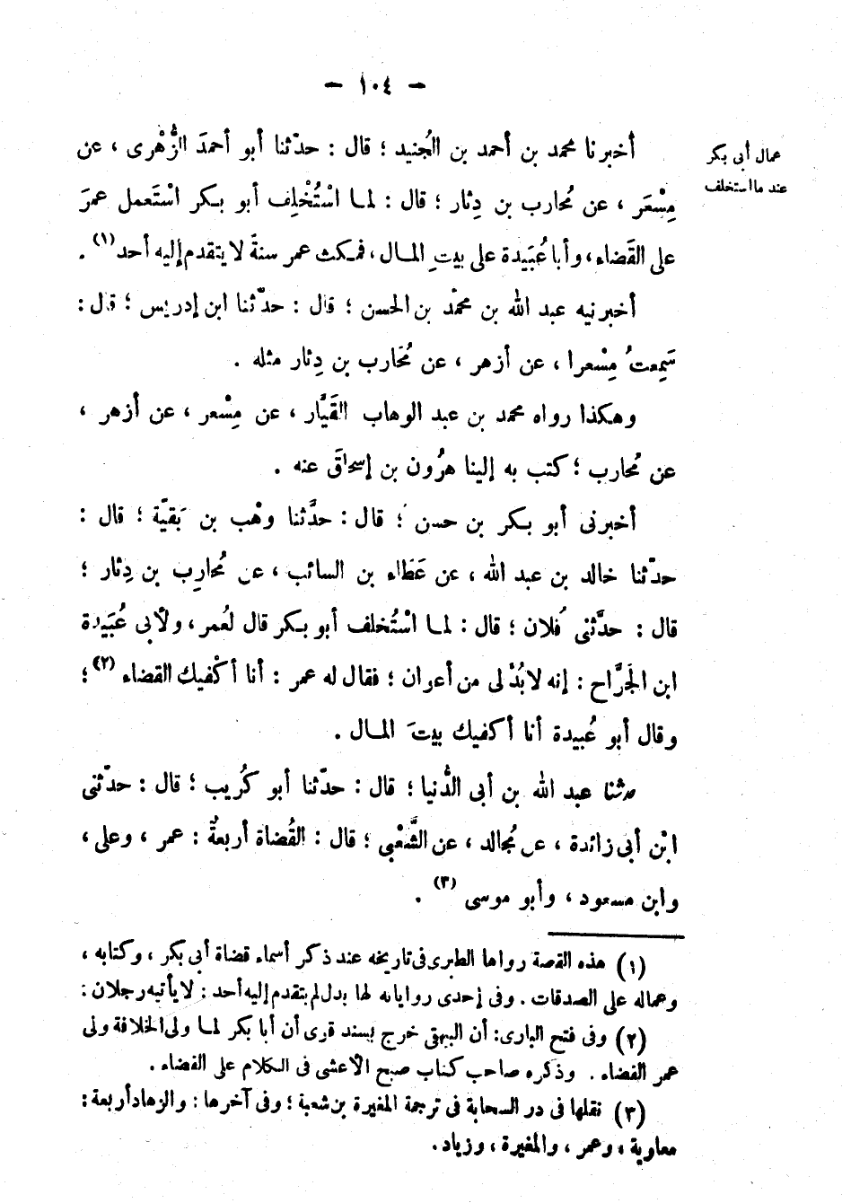 أَخْبَرَنِي أَبُو بكر بْن حسن؛ قال: حَدَّثَنَا وهب بْن بقية؛ قال: حَدَّثَنَا خالد بْن عَبْد اللهِ، عَن عطاء بْن السائب، عَن محارب بْن دثار؛ قال: حَدَّثَنِي فلان؛ قال: لما استخلف أَبُو بكر قَالَ لِعُمَرَ، ولأبي عبيدة ابن الجراح: إنه لا بد لي من أعوان؛ فَقَالَ لَهُ عُمَر: أنا أكفيك القضاء؛ وقَالَ أَبُوْعُبَيْدَةَ أنا أكفيك بيت المال.
