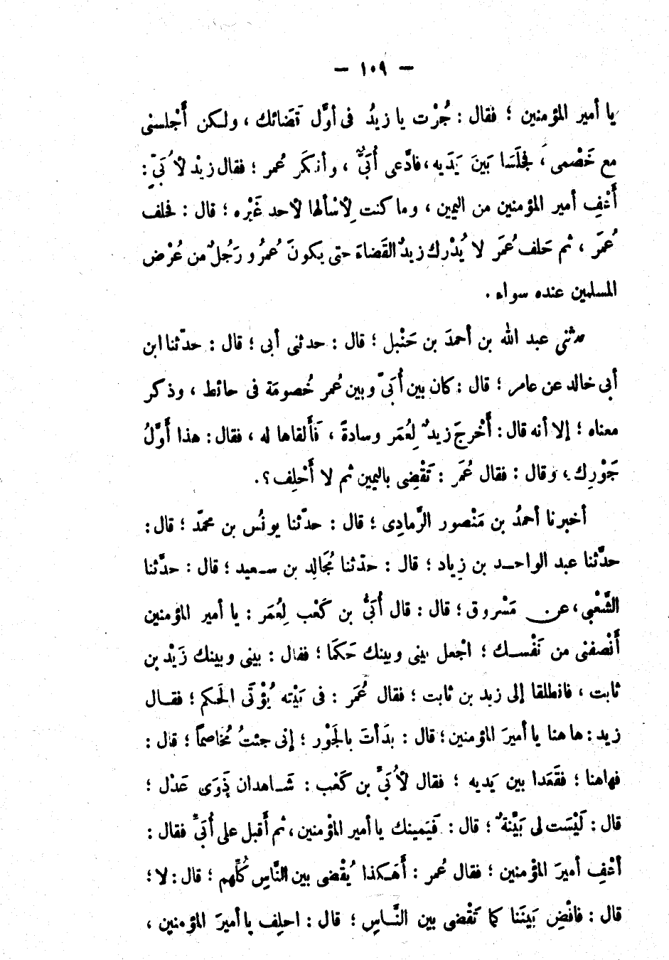 حَدَّثَنِي عَبْدُ اللهِ بْن أَحْمَد بْن حنبل؛ قال: حَدَّثَنِي أبي؛ قال: حَدَّثَنَا ابن أبي خالد عَن عامر؛ قال: كان بين أبي وبين عُمَر خصومة في حائط، وذكر معناه؛ إِلَّا أنه قال: أخرج زيد لِعُمَرَ وسادةً، فألقاها له، فقال: هَذَا أول جورك؛ وقال: فَقَالَ عُمَرُ: تقضي باليمين ثم لا أحلف ?.