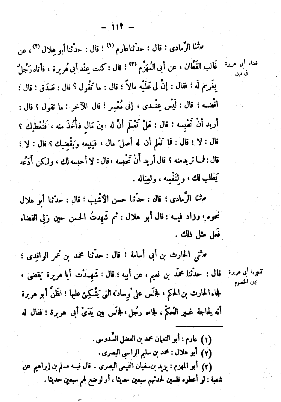 حَدَّثَنَا الرمادي؛ قال: حَدَّثَنَا عارم؛ قال: حَدَّثَنَا أَبُو هلال، عَن غالب القطان، عَن أبي المهزم؛ قال: كنت عند أبي هريرة، فأتاه رجل بغريم له؛ فقال: إن لي عليه مالاً؛ قال: ما تقول ? قال: صدق؛ قال: اقضه؛ قال: ليس عندي، إني معسر؛ قَالَ: للآخر: ما تقول ? قال: أريد أن تحبسه؛ قال: هَلْ تعلم أن له عين مال فأخذ منه، فنعطيك ? قال: لا؛ قال: فما تعلم أن له أصل مال، فيبيعه ويقضيك ? قال: لا؛ قال: فما تريد منه ? قَالَ: أريد أن تحبسه، قال: لا أحبسه لك، ولكن أدعه يطلب لك، ولنفسه، ولعياله.