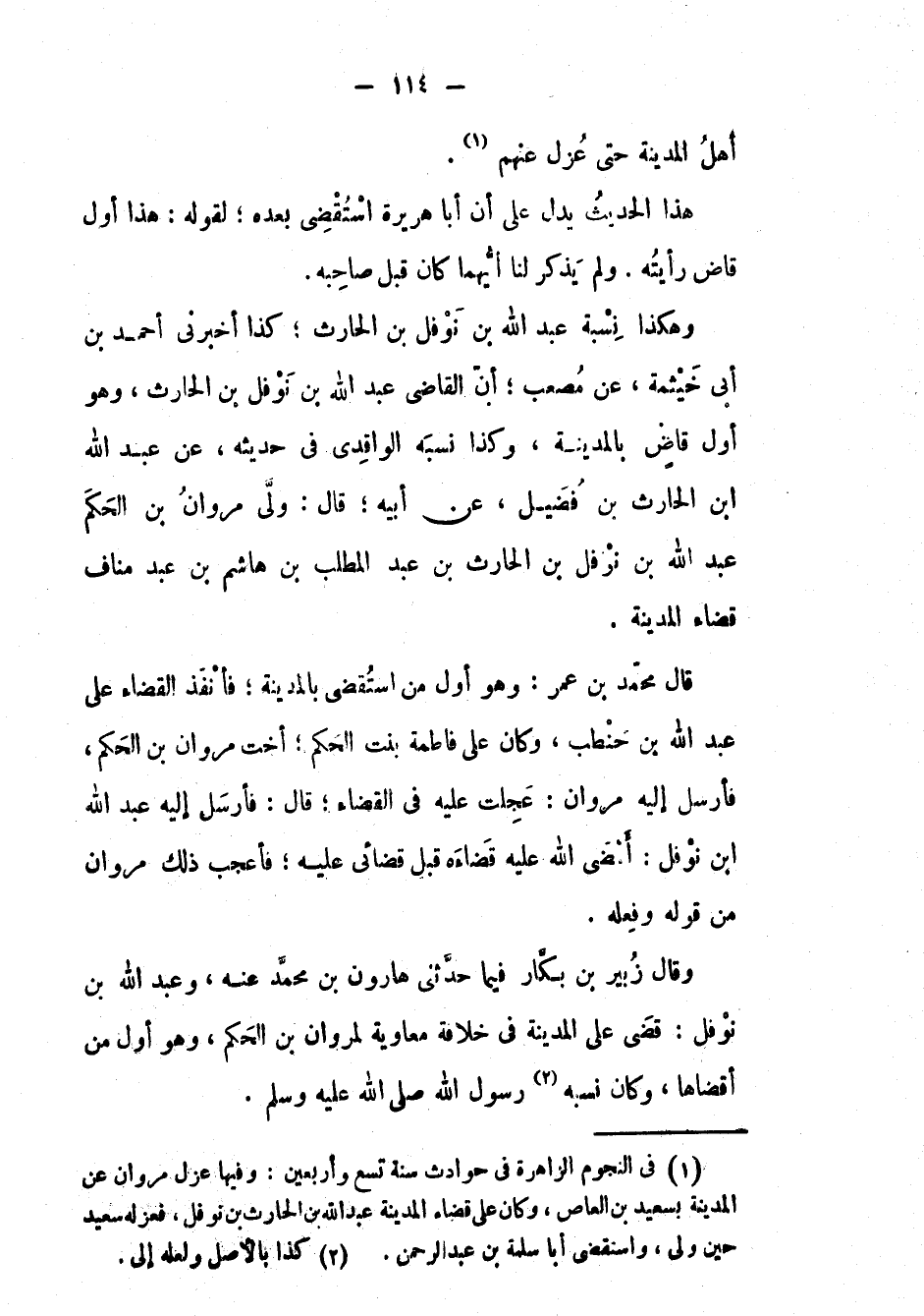 وقَالَ: زبير بْن بكار فيما حَدَّثَنِي هارون بْن مُحَمَّد عنه، وعَبْد اللهِ بْن نوفل: قضى على المدينة في خلافة معاوية لمروان بْن الحكم، وهو أول من أقضاها، وكان نسبه (إلى) رسول الله صَلَّى اللَّهُ عَلَيْهِ وَسَلَّمَ