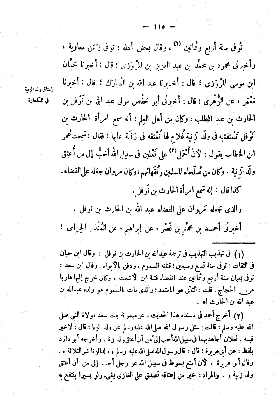 وأَخْبَرَنِي محمود بْن مُحَمَّد بْن عَبْد العزيز بْن المروزي؛ قال: أَخْبَرَنَا حيان ابن موسى المروزي؛ قال: أَخْبَرَنَا عَبْد اللهِ بْن المبارك؛ قال: أَخْبَرَنَا مَعْمَر، عَن الزهري؛ قال: أَخْبَرَنِي أَبُو حفص مولى عَبْد اللهِ بْن نوفل بْن الحارث بْن عَبْد المطلب، وكان من أهل العلم: أنه سمع امرأة الحارث بْن نوفل تستفتيه في ولد زنية غلام لها تعتقه في رقبة عليها؛ فقال: سمعت عُمَر بْن الخطاب يقول: لأن أحمل على نعلين في سبيل الله أحب إِلَى من أعتق ولد زنية.