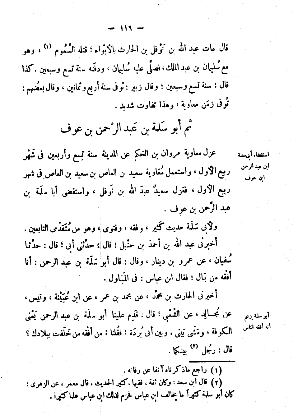 ... عزل معاوية مروان بْن الحكم عَن المدينة سنة تسع وأربعين في شهر ربيع الأول، واستعمل معاوية سعيد بْن العاص بْن سعيد بْن العاص في شهر ربيع الأول، فعزل سعيد عَبْد اللهِ بْن نوفل، واستقضى أبا سلمة بْن عَبْد الرحمن بْن عوف. ولأبي سلمة حديث كثير، وفقه، وفتوى، وهو من متقدمي التابعين.