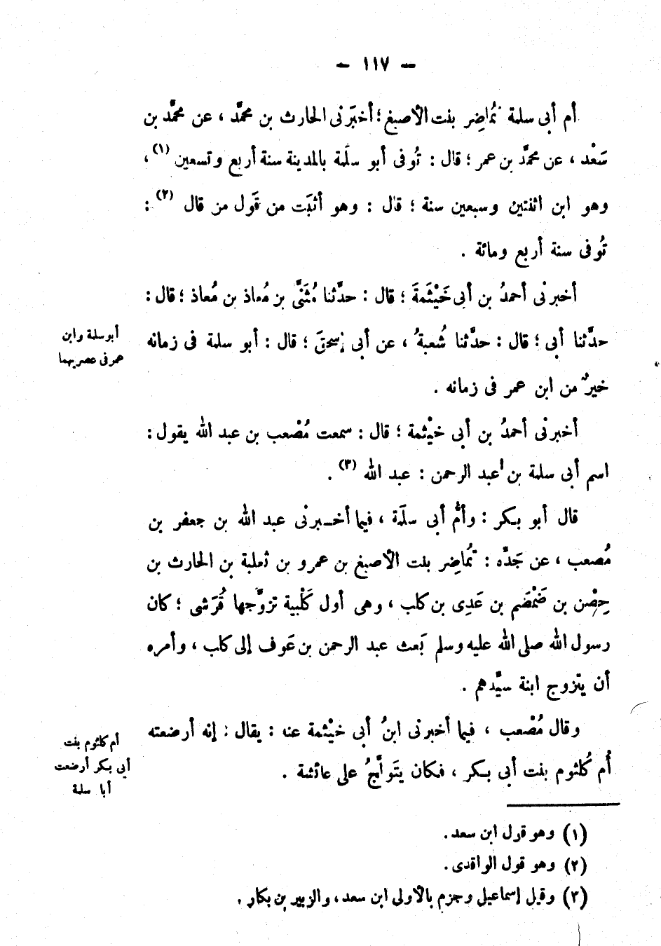 أم أبي سلمة، تماضر بنت الأصبغ؛ أَخْبَرَنِي الحارث بْن مُحَمَّد، عَن مُحَمَّد بْن سعد، عَن مُحَمَّد بْن عُمَر؛ قال: توفي أَبُو سلمة بالمدينة سنة أربع وتسعين، وهو ابن اثنتين وسبعين سنة؛ قال: وهو أثبت من قول من قال: توفي سنة أربع ومائة.