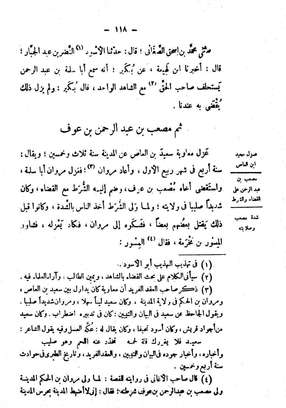 ... عزل معاوية سعيد بْن العاص عَن المدينة سنة ثلاث وخمسين؛ ويقال: سنة أربع في شهر ربيع الأول، وأعاد مروان؛ فعزل مروان أبا سلمة، واستقضى أخاه مصعب بْن عوف، وضم إليه الشرط مع القضاء، وكان شديداً صليبا في ولايته؛ ولما ولي الشرط أخذ الناس بالشدة، وكانوا قبل ذلك يقتل بعضهم بعضاً، فشكوه إِلَى مروان، فكاد يعزله، فشاور المسور بْن مخرمة، فَقَالَ: المسور: