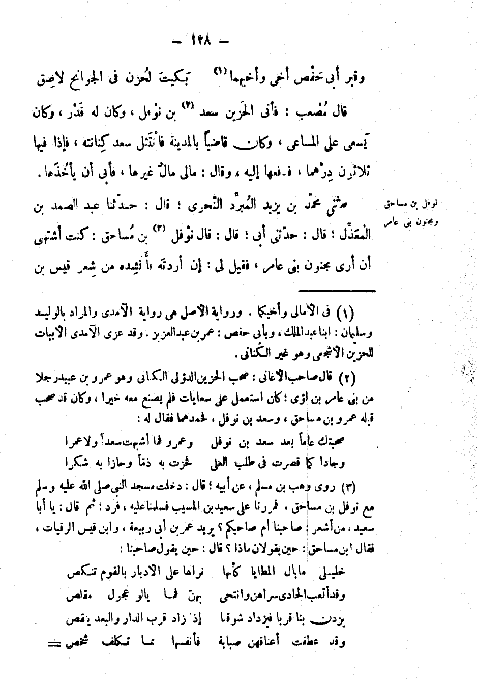 حَدَّثَنِي مُحَمَّد بْن يزيد المبرد النحوي؛ قال: حَدَّثَنَا عَبْدُ الصمد بْن المعدل؛ قال: حَدَّثَنِي أبي؛ قال: قَالَ: نوفل بْن مساحق: كنت أشتهي أن أرى مجنون بني عامر، فقيل لي: إن أردته فأنشده من شعر قيس بن