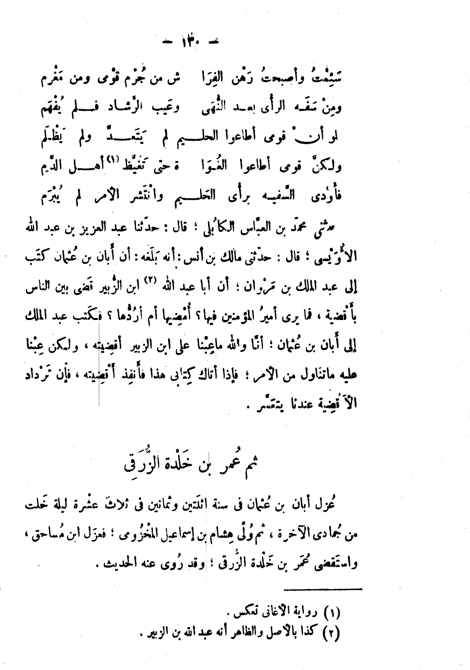 حَدَّثَنِي مُحَمَّد بْن العباس الكابلي؛ قال: حَدَّثَنَا عَبْدُ العزيز بْن عَبْد اللهِ الأويسي؛ قال: حَدَّثَنِي مالك بْن أنس: أنه بلغه: أن أبان بْن عُثْمَان كتب إِلَى عَبْدِ الملك بْن مروان؛ أن أبا عَبْد اللهِ ابن الزبير قضى بين الناس بأقضية، فما يرى أمير المؤمنين فيها ? أمضيها أم أردها ? فكتب عَبْد الملك إِلَى أبان بْن عثمان؛ أنا والله ما عبنا على ابن الزبير أقضيته، ولكن عبنا عليه ما تناول من الأمر؛ فإذا أتاك كتابي هَذَا فأنفذ أقضيته، فإن ترداد الأقضية عندنا يتعسر. ثم