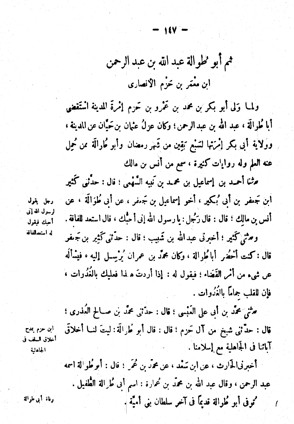 ... ولما ولي أَبُو بكر بْن مُحَمَّد بْن عَمْرو بْن حزم إمرة المدينة استقضى أبا طوالة، عَبْد اللهِ بْن عَبْد الرحمن؛ وكان عزل عُثْمَان بْن حيان عَن المدينة، وولاية أبي بكر إمرتها لسبع بقين من شهر رمضان وأَبُو طوالة ممن حمل عنه العلم وله روايات كثيرة، سمع من أنس بْن مالك.