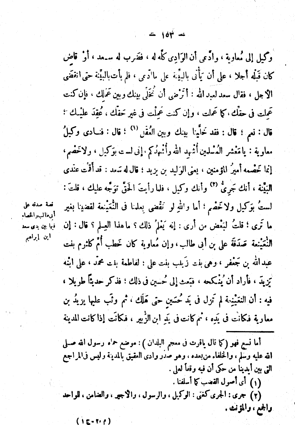 وكيل إِلَى معاوية، وادعى أن الوادي كله له، فضرب له سعد، أو قاض كان قبله أجلا، على أن يأتي بالبينة على ما ادعى، فلم يأت بالبينة حتى انقضى الأجل، فَقَالَ: سعد لعَبْد اللهِ: أترضى أن نخلي بينك وبين عملك، فإن كنت عملت في حقك، كما عملت، وإن كنت عملت في غير حقك، عقد عليك؛ قال: نعم؛ قال: فقد خلينا بينك وبين العقل؛ قال: فنادى وكيل معاوية: يا معشر المسلمين أشهد الله وأشهدكم، إني لست بوكيل، ولا خصم، إنما خصمه أمير المؤمنين، يعني الوليد بْن يزيد؛ قَالَ: له سعد: قد أقمت عندي البينة، أنك جري وأنك وكيل، فلما رأيت الحق توجه عليك، قلت: لست بوكيل ولا خصم؛ أما والله لو نقضي بعلمنا في النعينعة لقضينا بغير ما ترى؛ قلت لبعض من أرى: إنه يعلم ذلك ? ما هَذَا العلم ? قال: إن النعينعة صدقة علي بْن أبي طالب، وإن معاوية كان خطب أم كلثوم بنت عَبْد اللهِ بْن جعفر، وهي بنت زينب بنت علي؛ لفاطمة بنت مُحَمَّد، على ابنه يزيد، فأراد أن ينكحه، فبعث إِلَى حسين في ذلك؛ فذكر حديثاً طويلاً، فيه: أن النعينعة لم تزل في يد حسين حتى هلك، ثم وثب عليها يزيد بْن معاوية فكانت في يده، ثم كانت في يد ابن الزبير، فكانت إِذَا كانت المدينة