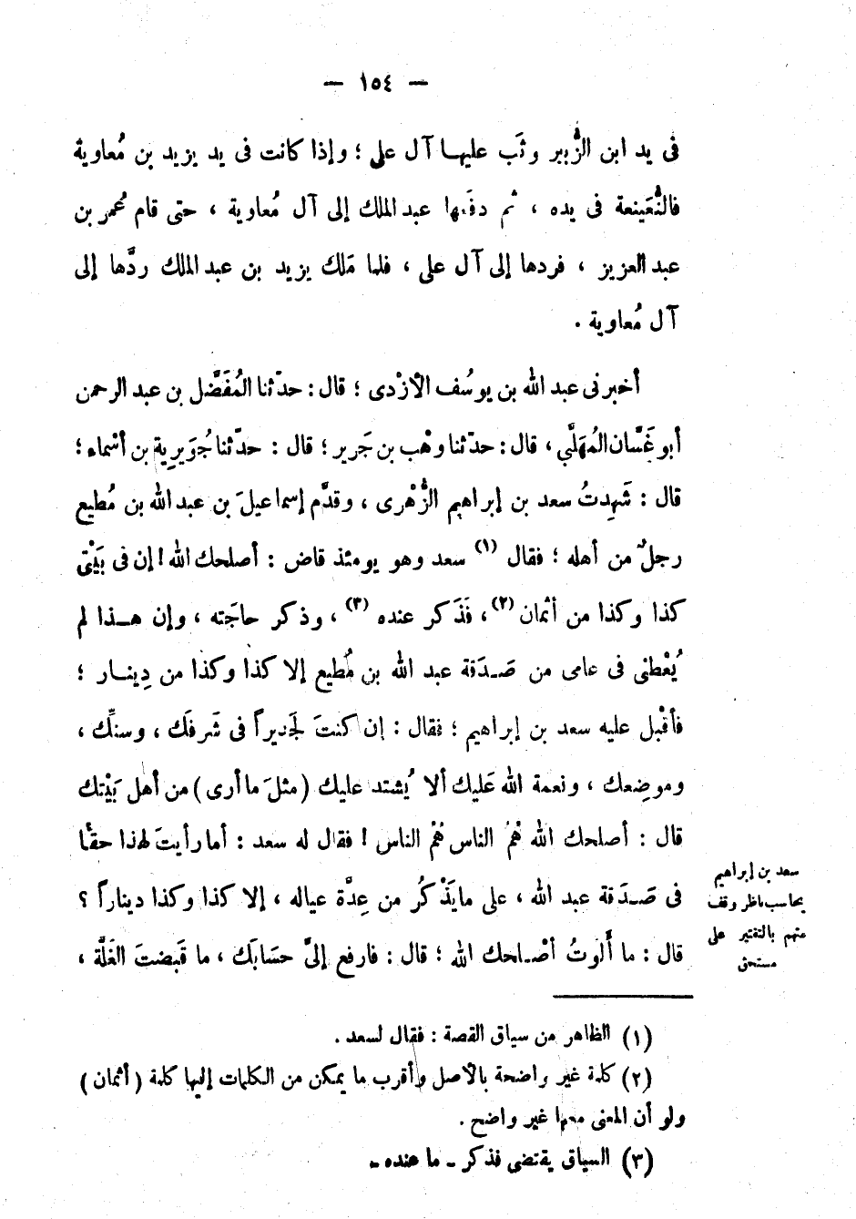 أَخْبَرَنِي عَبْد اللهِ بْن يوسف الأزدي؛ قال: حَدَّثَنَا المفضل بْن عَبْد الرحمن أَبُو غسان المهلبي، قال: حَدَّثَنَا وهب بْن جرير؛ قال: حَدَّثَنَا جويرية بْن أسماء؛ قال: شهدت سعد بْن إبراهيم الزهري، وقدم إسماعيل بْن عَبْد اللهِ بْن مطيع رجل من أهله؛ فَقَالَ: سعد وهو يومئذ قاض: أصلحك الله! إن في بيتي كذا وكذا من أثمان، فذكر عنده، وذكر حاجته، وإن هَذَا لم يعطني في عامي من صدقة عَبْد اللهِ بْن مطيع إِلَّا كذا وكذا من دينار؛ فأقبل عليه سعد بْن إبراهيم؛ فقال: إن كنت لجديراً في شرفك، وسنك، وموضعك، ونعمة الله عليك ألا يشتد عليك مثل ما أرى من أهل بيتك قال: أصلحك الله هم الناس هم الناس! فَقَالَ لَهُ سعد: أما رأيت لهَذَا حقاً في صدقة عَبْد اللهِ، على ما يذكر من عدة عياله، إِلَّا كذا وكذا ديناراً ? قال: ما ألوت أصلحك الله؛ قال: فارفع إلي حسابك، ما قبضت الغلة،