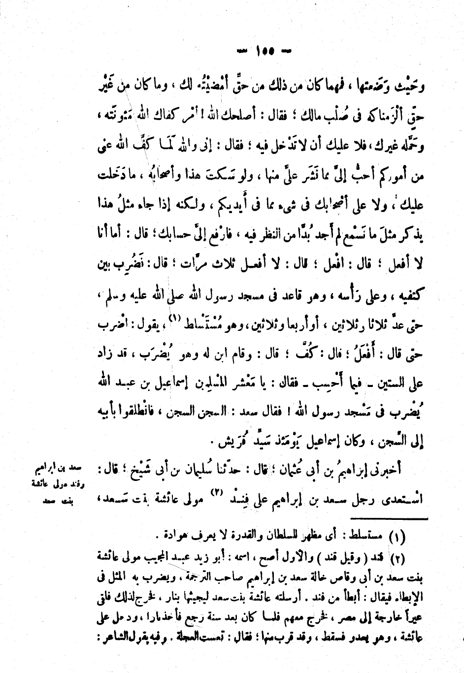 وحَيْثُ وضعتها، فمهما كان من ذلك من حق أمضيته لك، وما كان من غير حق ألزمناكه في صلب مالك؛ فقال: أصلحك الله! أمر كفاك الله مئونته، وحمله غيرك، فلا عليك أن لا تدخل فيه؛ فقال: إني والله لما كف الله عني من أموركم أحب إلي مما نشر علي منها، ولو سكت هَذَا وأصحابه، ما دخلت عليك، ولا على أصحابك في شيء مما في أيديكم، ولكنه إِذَا جاء مثل هَذَا يذكر مثل ما نسمع لم أجد بداً من النظر فيه، فارفع إلي حسابك؛ قال: أما أنا لا أفعل؛ قال: افعل؛ قال: لا أفعل ثلاث مرات؛ قال: فضرب بين كتفيه، وعلى رأسه، وهو قاعد في مسجد رسول الله صَلَّى اللَّهُ عَلَيْهِ وَسَلَّمَ، حتى عد ثلاثاً وثلاثين، أو أربعاً وثلاثين، وهو مستسلط، يقول: اضرب حتى قال: أفعل؛ قال: كف؛ قال: وقام ابن له وهو يضرب، قد زاد على الستين فيما أحسب فقال: يا معشر المسلمين إسماعيل بْن عَبْد اللهِ يضرب في مسجد رسول الله! فَقَالَ: سعد: السجن السجن، فانطلقوا بأبيه إِلَى السجن، وكان إسماعيل يومئذ سيد قريش.