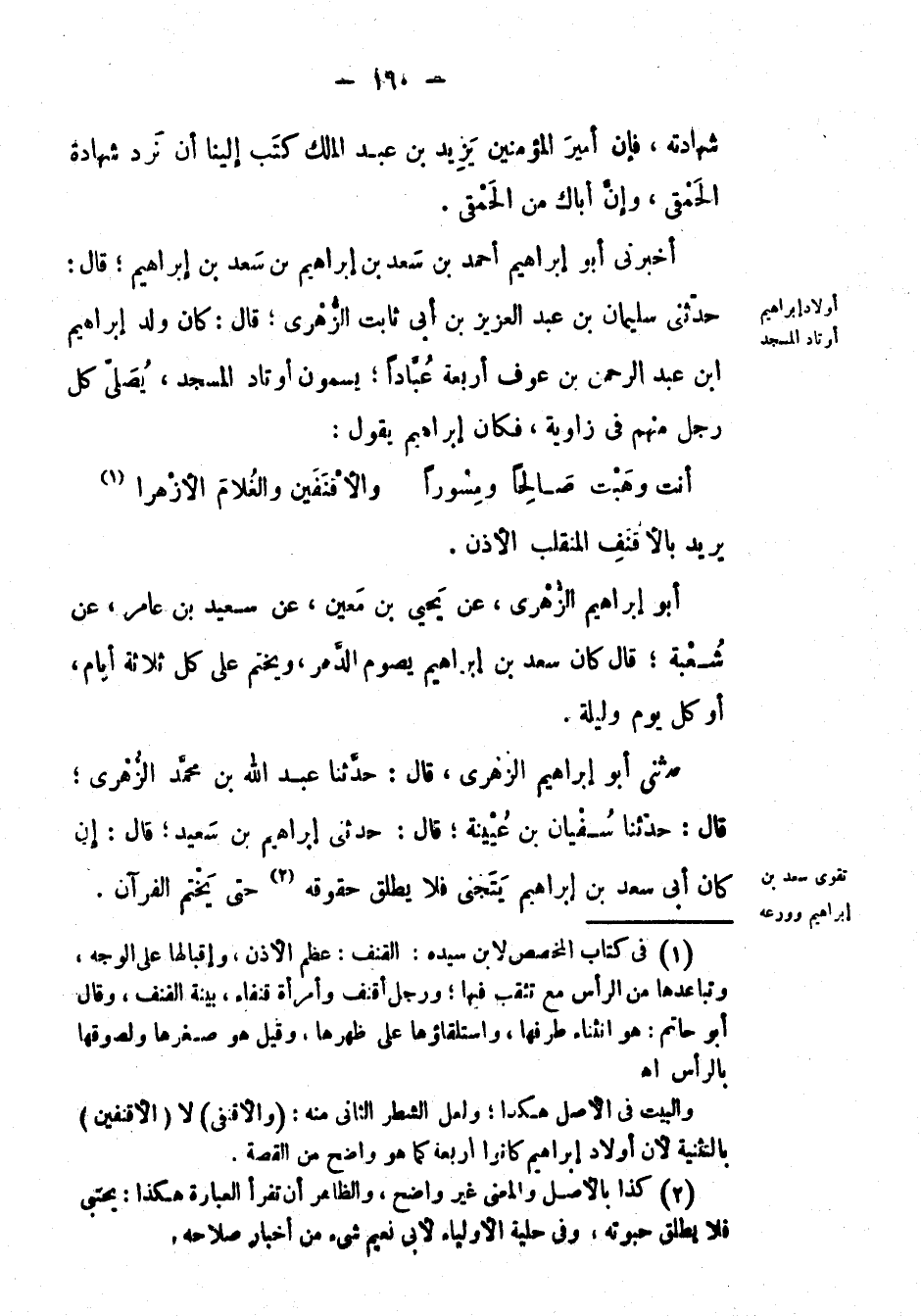 أَخْبَرَنِي أَبُو إبراهيم أَحْمَد بْن سعد بْن إبراهيم بْن سعد بْن إبراهيم؛ قال: حَدَّثَنِي سليمان بْن عَبْد العزيز بْن أبي ثابت الزهري؛ قال: كان ولد إبراهيم ابن عَبْد الرحمن بْن عوف أربعة عباداً؛ يسمون أوتاد المسجد، يصلي كل رجل منهم في زاوية، فكان إبراهيم يقول: