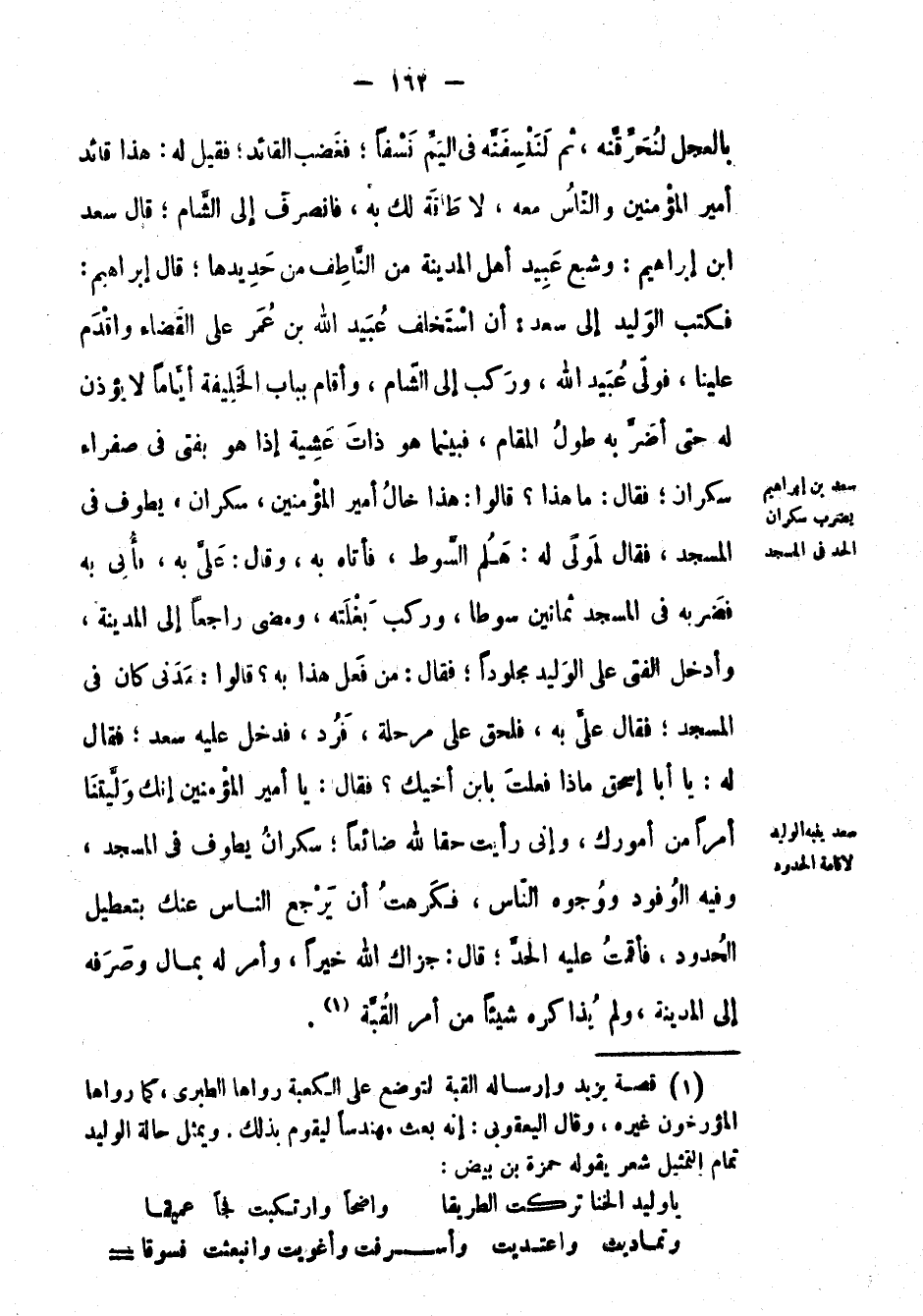 بالعجل لنحرقنه، ثم لننسفنه في اليم نسفاً؛ فغضب القائد؛ فقيل له: هَذَا قائد أمير المؤمنين والناس معه، لا طاقة لك به، فانصرف إِلَى الشام؛ قَالَ: سعد ابن إبراهيم: وشبع عبيد أهل المدينة من الناطف من حديدها؛ قَالَ: إبراهيم: فكتب الوليد إِلَى سعد: أن استخلف عبيد الله بْن عُمَر على القضاء وأقدم علينا، فولي عبيد الله، وركب إِلَى الشام، وأقام بباب الخليفة أياماً لا يؤذن له حتى أضر به طول المقام، فبينما هو ذات عشية إِذَا هو بفتى في صفراء سكران؛ فقال: ما هَذَا ? قالوا: هَذَا خال أمير المؤمنين، سكران، يطوف في المسجد، فَقَالَ: لمولىً له: هلم السوط، فأتاه به، وقال: علي به، فأبى به فضربه في المسجد ثمانين سوطاً، وركب بغلته، ومضى راجعاً إِلَى المدينة، وأدخل الفتى على الوليد مجلوداً؛ فقال: من فعل هَذَا به ? قالوا: مدني كان في المسجد؛ فَقَالَ: علي به، فلحق على مرحلة، فرد، فدخل عليه سعد؛ فَقَالَ لَهُ: يا أبا إسحاق ماذا فعلت بابن أخيك? فقال: يا أمير المؤمنين إنك وليتنا أمراً من أمورك، وإني رأيت حقاً لله ضائعاً؛ سكران يطوف في المسجد، وفيه الوفود ووجوه الناس، فكرهت أن يرجع الناس عنك بتعطيل الحدود، فأقمت عليه الحد؛ قال: جزاك الله خيراً، وأمر له بمال وصرفه إِلَى المدينة، ولم يذاكره شيئاً من أمر القبة.