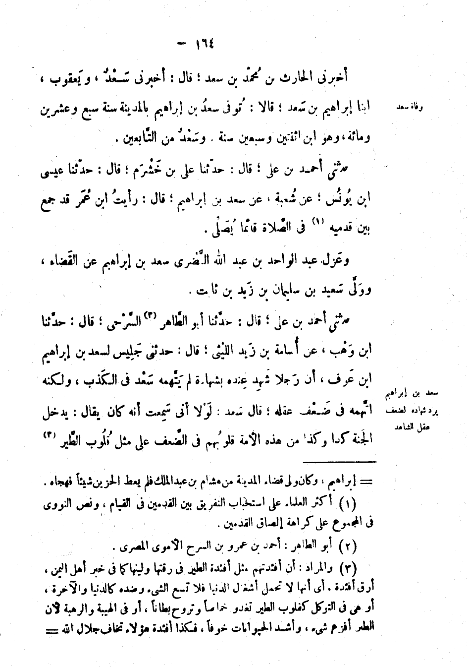حَدَّثَنِي أَحْمَد بْن علي؛ قال: حَدَّثَنَا أَبُو الطاهر السرحي؛ قال: حَدَّثَنَا ابن وهب، عَن أسامة بْن زيد الليثي؛ قال: حَدَّثَنِي جليس لسعد بْن إبراهيم ابن عوف، أن رجلاً شهد عنده بشهادة لم يتهمه سعد في الكذب، ولكنه اتهمه في ضعف عقله؛ قَالَ: سعد: لولا أني سمعت أنه كان يقال: يدخل الجنة كذا وكذا من هذه الأمة قلوبهم في الضعف على مثل قلوب الطير