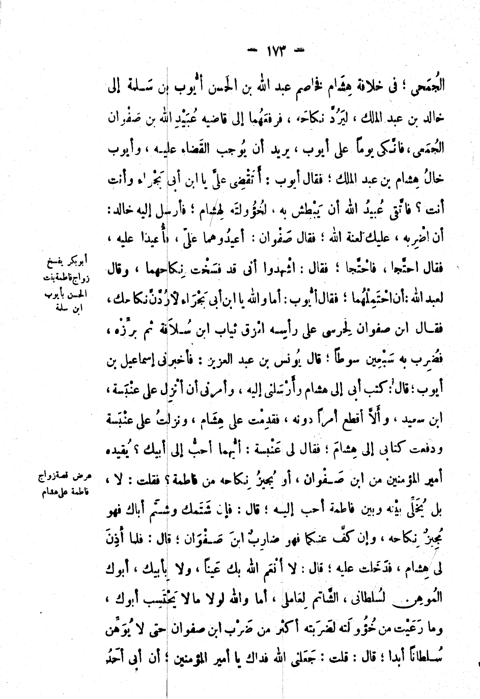 قَالَ: يونس بْن عَبْد العزيز: فأَخْبَرَنِي إسماعيل بْن أيوب؛ قال: كتب أبي إِلَى هشام وأرسلني إليه، وأمرني أن أنزل على عنبسة، ابن سعيد، وألا اقطع أمراً دونه، فقدمت على هشام، ونزلت على عنبسة ودفعت كتابي إِلَى هشام؛ فَقَالَ لي: عنبسة: أيهما أحب إِلَى أبيك? يقيده أمير المؤمنين من ابن صفوان، أو يجيز نكاحه من فاطمة ? فقلت: لا، بل يخلي بينه وبين فاطمة أحب إليه؛ قال: فإن شتمك وشتم أباك فهو مجيز نكاحه، وإن كف عنكما فهو ضارب ابن صفوان؛ قال: فلما أذن لي هشام، فدخلت عليه؛ قال: لا أنعم الله بك عيناً، ولا بأبيك، أَبُوك الموهن لسلطاني، الشاتم لعاملي، أما والله لولا ما لا يحتسب أَبُوك، وما رعيت من خؤولته لضربته أكثر من ضرب ابن صفوان حتى لا يوهن سلطاناً أبدا؛ قال: قلت: جعلني الله فداك يا أمير المؤمنين؛ إن أبي أحد