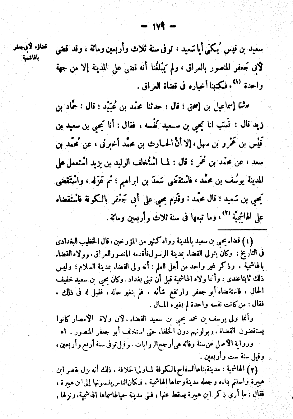 حَدَّثَنَا إسماعيل بْن إسحاق؛ قال: حَدَّثَنَا مُحَمَّد بْن عبيد؛ قال: حماد بْن زيد قال: نسب لنا يحيى بْن سعيد نفسه، فقال: أنا يحيى بْن سعيد بْن قيس بْن عَمْرو بْن سهل، إِلَّا أن الحارث بْن مُحَمَّد أَخْبَرَنِي، عَن مُحَمَّد بْن سعد، عَن مُحَمَّد بْن عُمَر؛ قال: لما استخلف الوليد بْن يزيد استعمل على المدينة يوسف بْن مُحَمَّد، فاستقضى سعد بْن إبراهيم؛ ثم عزله، واستقضى يحيى بْن سعيد؛ قَالَ: مُحَمَّد: وقدم يحيى على أبي جعفر بالكوفة فاستقضاه على الهاشمية، وما تبعها في سنة ثلاث وأربعين ومائة.