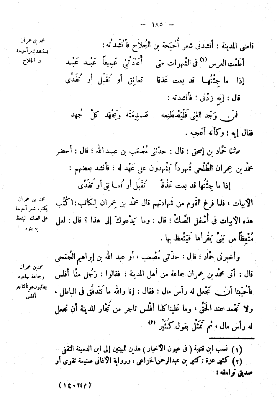 حَدَّثَنَا حماد بْن إسحاق؛ قال: حَدَّثَنِي مصعب بْن عَبْد اللهِ؛ قال: أحضر مُحَمَّدبْن عِمْرَان الطلحي شهوداً يشهدون على عهد له؛ فأنشد بعضهم: