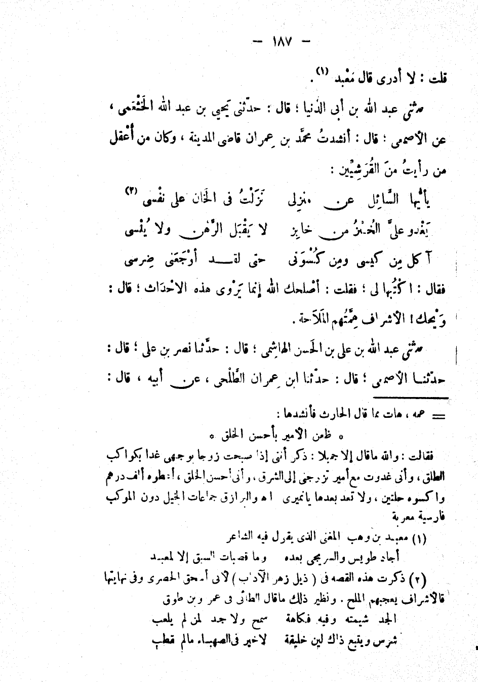 حَدَّثَنِي عَبْدُ اللهِ بْن علي بْن الْحَسَن الهاشمي؛ قال: حَدَّثَنَا نصر بْن علي؛ قال: حَدَّثَنَا الأصمعي؛ قال: حَدَّثَنَا ابن عِمْرَان الطلحي، عَن أبيه، قال: