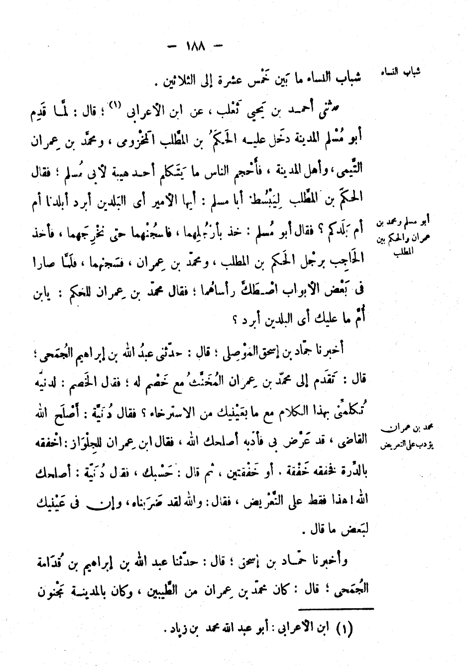 حَدَّثَنِي أَحْمَد بْن يحيى ثعلب، عَن ابن الأعرابي؛ قال: لما قدم أَبُو مسلم المدينة دخل عليه الحكم بْن المطلب المخزومي، ومُحَمَّدبْن عِمْرَان التيمي، وأهل المدينة، فأحجم الناس ما يتكلم أحد هيبة لأبي مسلم؛ فَقَالَ: الحكم بْن المطلب ليبسط أبا مسلم: أيها الأمير أي البلدين أبرد أبلدنا أم أم بلدكم ? فَقَالَ: أَبُو مسلم: خذ بأرجلهما، فاسجنهما حتى نخرجهما، فأخذ الحاجب برجل الحكم بْن المطلب، ومُحَمَّدبْن عِمْرَان، فسجنهما، فلما صارا في بعض الأَبُواب اصطك رأساهما؛ فَقَالَ مُحَمَّدبْن عِمْرَان: للحكم: يا بْن أم ما عليك أي البلدين أبرد ?