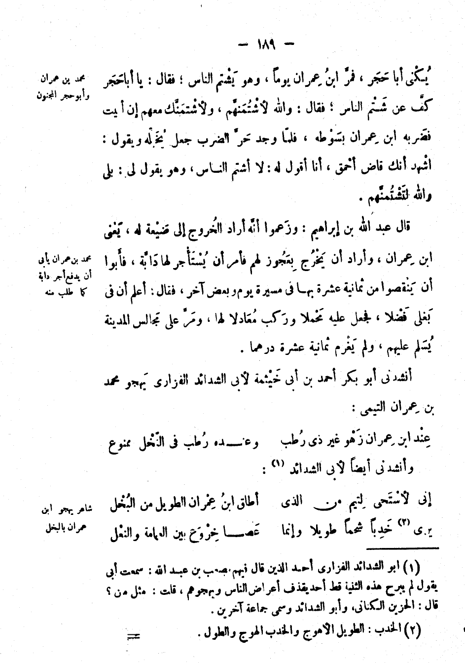 أنشدني أَبُو بكر أَحْمَد بْن أبي خيثمة لأبي الشدائد الفزاري يهجو مُحَمَّدبْن عِمْرَان التيمي: