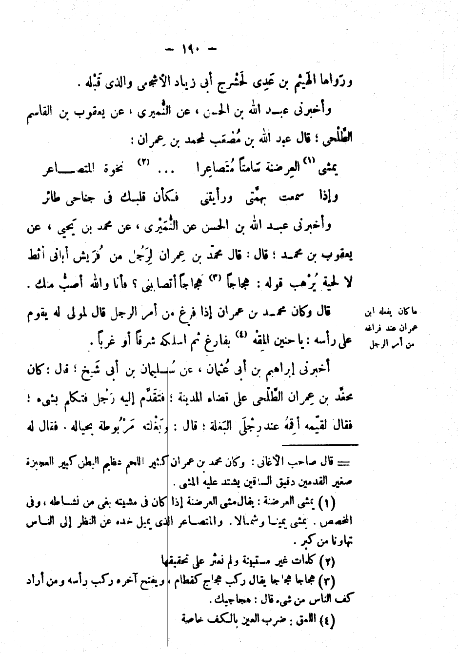 وأَخْبَرَنِي عَبْد اللهِ بْن الْحَسَن عَن النميري، عَن مُحَمَّد بْن يحيى، عَن يعقوب بْن مُحَمَّد؛ قال: قَالَ مُحَمَّدبْن عِمْرَان: لرجل من قريش أباني أثط لا لحية يرهب قوله: هجاجاً هجاجاً أتصابني? فأنا والله أصب منك.